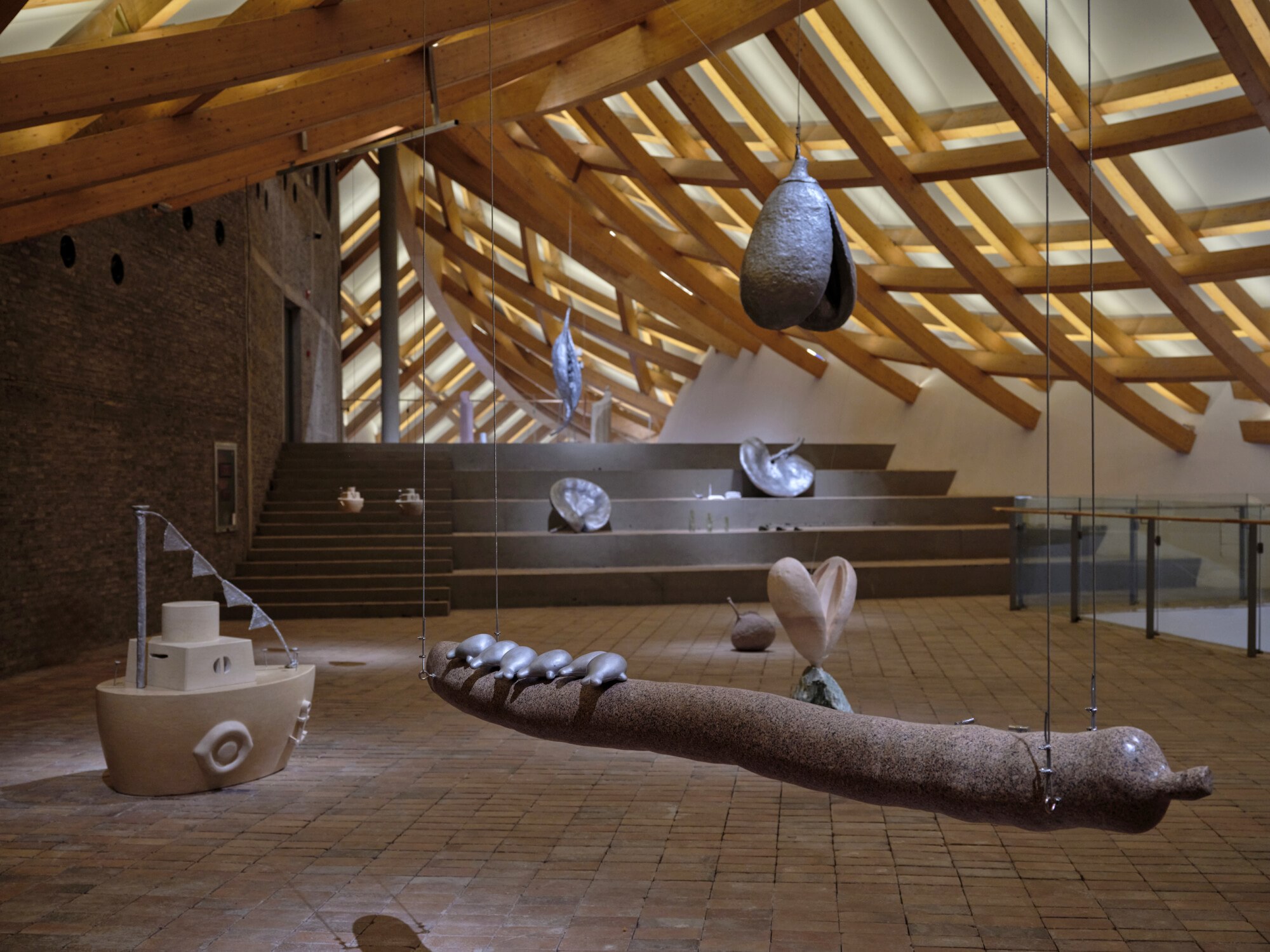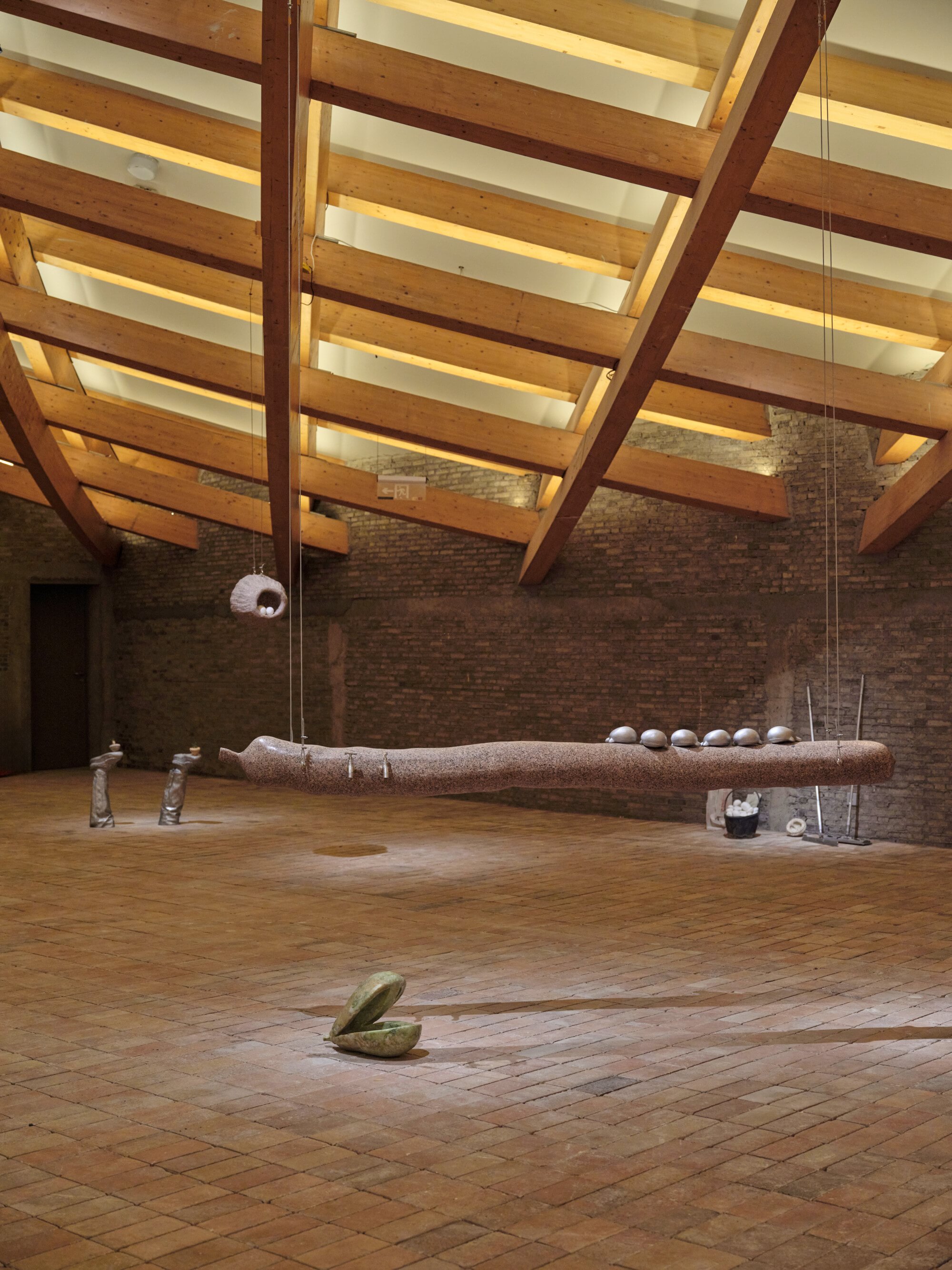 Although the work’s title evokes a natural soundscape of waterflows and birdsongs, it is actually silent. This deliberate quietness, along with the marble-carved seeds and internal organs, serve to activate the viewer’s own sensory awareness, directing their attention toward the invisible network of phenology formed by otherwise imperceptible circulations of matter and exchanges of information—including mobile coverage, wind, seeds, and the coordinated workings of internal organs. Visitors are invited to wander through the installation as if they themselves were sensing devices: if we remain open to all signals, what might we hear? Referencing the framework proposed by Donna Haraway, we may see ourselves as part of a knotted-together network of “sympoiesis” (making-with). In a state of quite observation, we can reflect on how the artificial intertwines with the natural, how technology becomes internalized as part of life, and how matter quietly records stories of coexistence between humans and the natural world. Also featured is Recipes for Breathing (2024), a seashell form fitted with hinges and clasps, which enters into dialogue with Zhou Xiaohu’s investigations into maritime remnants, together extending the narrative dimensions of material.