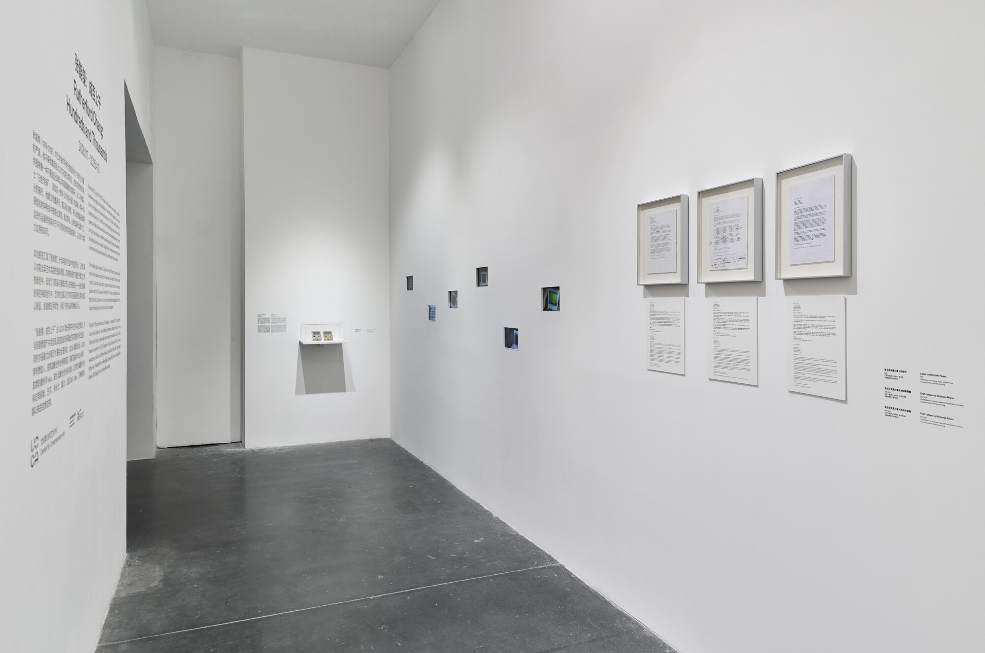 Another significant work in the exhibition, Game Boy Tetris (2013-2018) is a performative project comprising more than 2,000 recordings of Tetris gameplay, exhibited alongside letters Chang wrote to Nintendo Power magazine and the handheld consoles he used. Created between 2013 and 2018, the work traces the artist’s durational investigation of labor through repetition, endurance, and self-imposed systems of measurement. Chang filmed himself playing Tetris on Nintendo Game Boy consoles, which are also presented in the installation, uploading the videos to his website gameboytetris.com (to allow audiences to search the games by score), and further presented eight live-streamed performances on Twitch. While approached as a meditative practice, the project was also framed by a deliberately quixotic attempt to approach the world record for Tetris. In 2016, he briefly ranked second on the video game record website Twin Galaxies, achieving a top score of 614,904 that remains the tenth highest recorded today.