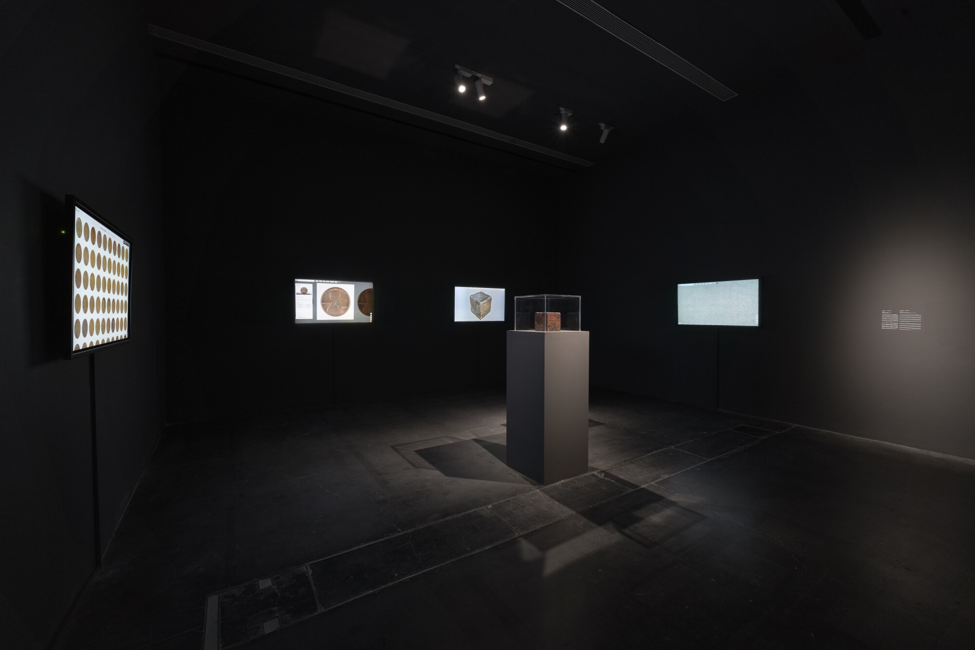 Echoing We Buy White Albums in its use of mass-produced, ostensibly identical objects, CENTS (2017-2024) is made of 10,000 American pennies minted before 1982, valued for their copper content. Chang photographed each coin to record its unique wear and patina, then transformed the collection into a 31-kilogram copper cube. The images of the original coins were also digitally inscribed on the Bitcoin blockchain, linking digital renderings of physical currency to virtual systems of value, a conceptual gesture that reflects on time, permanence, and the evolving methods of assigning material value. Visitors can explore the collection on touchscreens or in a book, observing how decades of circulation have left subtle abrasions and discoloration. As physical pennies fall out of use—the U.S. Mint permanently suspended their production in November 2025—the dense copper block asserts a tangible sense of value, offering a multimedia monument to the coin and an economy in transition.