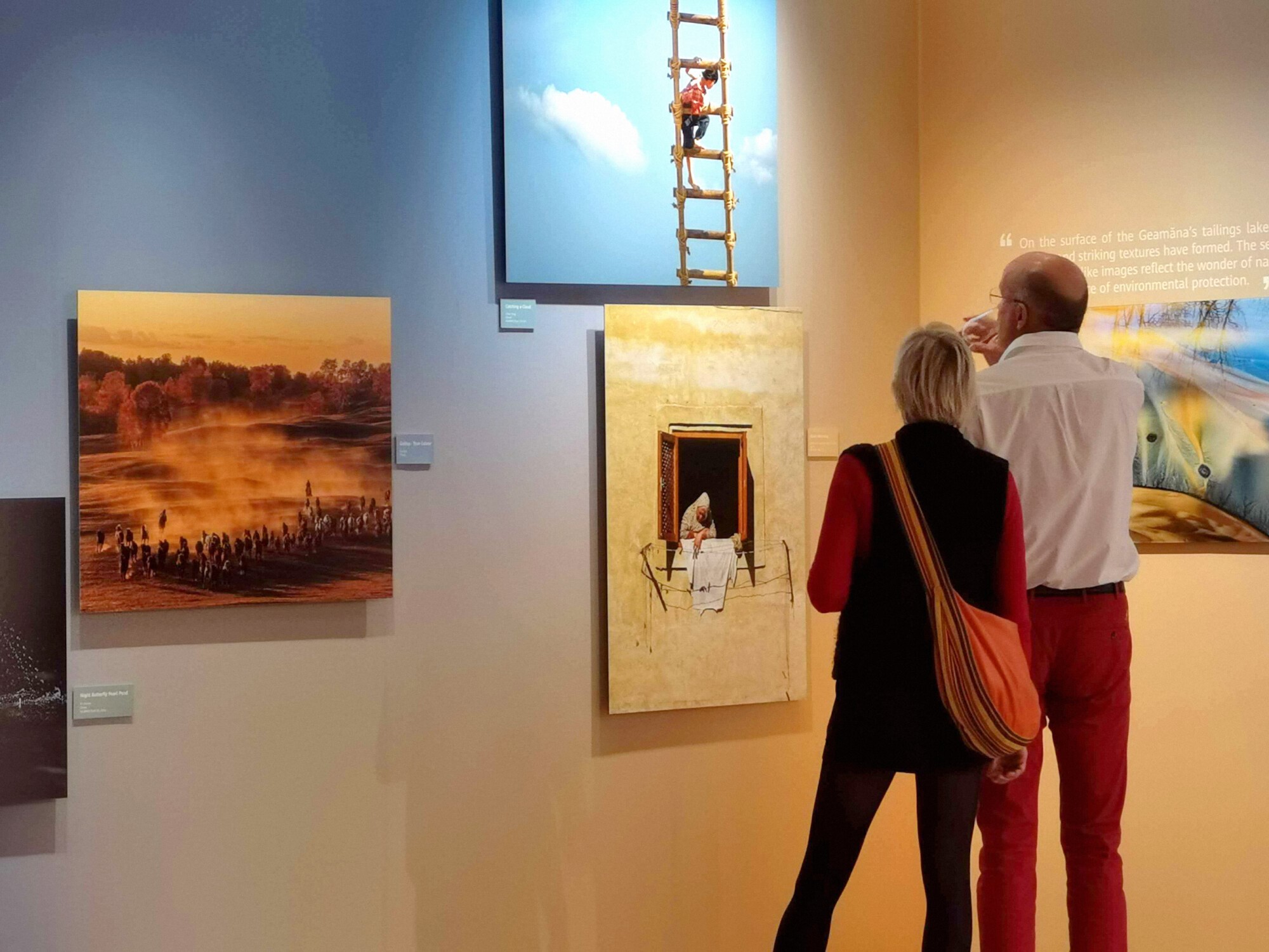 A (series of) photographic image is not only tangible evidence of reality, but also an open-ended enigma that cannot verify itself. It drifts ambiguously between fact and interpretation. Once released from the frozen moment, it can regain a vibrant context in new spaces of display—its interpretation open to the photographer, the subject, and the viewer alike. Between observation, understanding, imagination, and intent, what is constructed and what is perceived continually shape the very act of photographing. Against a backdrop in blue-to-yellow gradient, three pairs of dialogic works are placed in juxtaposition: a butterfly and a herd of galloping horses evoke the contrast between the microscopic and the monumental; an old woman opening a window and a child climbing skyward along a ladder trace a disparity in spatial scale; while a horn player and the breeze whispering through treetops insinuate the collision between sound and silence. Together, these visual pairings unfold layers of tension across the wall, reminding viewers that the meaning of an image always drifts between opposing poles. On the reverse side of the backdrop, Glimmer of Hope by Rhon Paolo C. Velarde delineates the silhouette of a figure in darkness with a beam of blue light, capturing a creeping anxiety from the fear and wonder when facing the unknown. Presented at the center of this section is the winner of the 2025 XMAGE Awards, Ethereal Lines, by Gheorghe Popa. From an arial view, the work captures the surreal curves and vivid color blocks on the toxic waters of the tailings lake at Geamăna. What first appears as abstract art, upon closer look, reveals both the sublime power of nature and the urgent realities of environmental degradation—an arresting juxtaposition of beauty and danger.