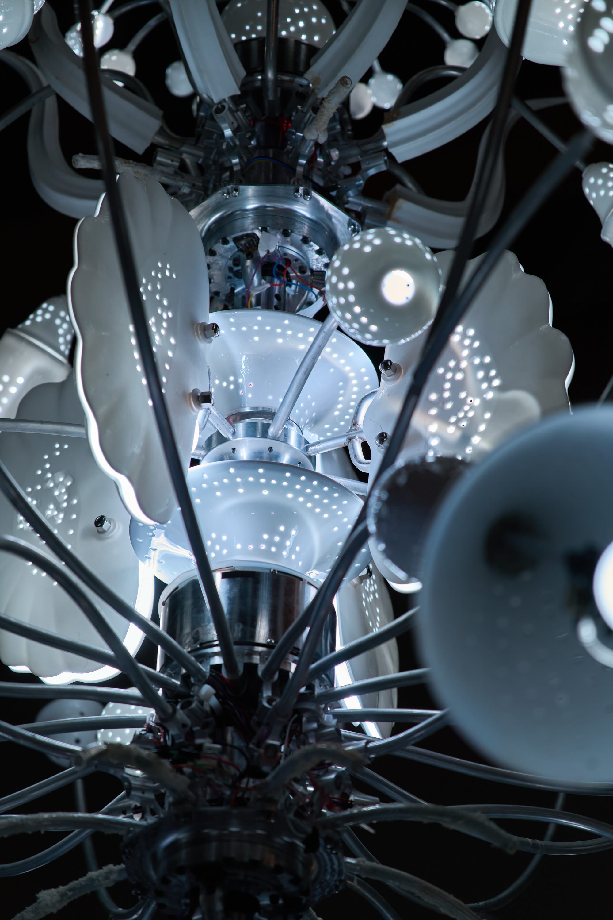 另一部分艺术家让存在与消亡互为燃料,把终点烧回起点。无用之用建筑工作室与若有光联合创作的《海错灯》(2025)将玲珑瓷有机融入工业金属机械,使其变幻为海洋生物一般可变可感的活性存在。创作者让工业金属杆骨架长出瓷质珊瑚,把被控制的人工形态重新生物化,死亡与新生在同一根支架上交迭。玲珑瓷这一形态从日常器物的缝隙中溢出,瓷不再是静态器皿,而是第一次拥有可转动的“关节”,成为可伸缩、可呼吸,可以被聆听和感知的机械——生物混合体。耿雪(1983年出生于吉林)的《金色之名(影像)》(2019)以巨幅影像形式冲破陶瓷媒介在感官上的局限,通过由泥土构建的叙事性景观表达她对生命意义的焦虑与质疑。她用象征生命的泥土捏出没有性别区分的小人,再让他们拿彼此的身体去填给更宏大之物,在黑白影像里不断地被带走、被卷入。她保留泥土的粗粝质感,让泥人替自己说出现实世界中人的生存和生命,使“存在与消亡”变成一部循环播放的默片。