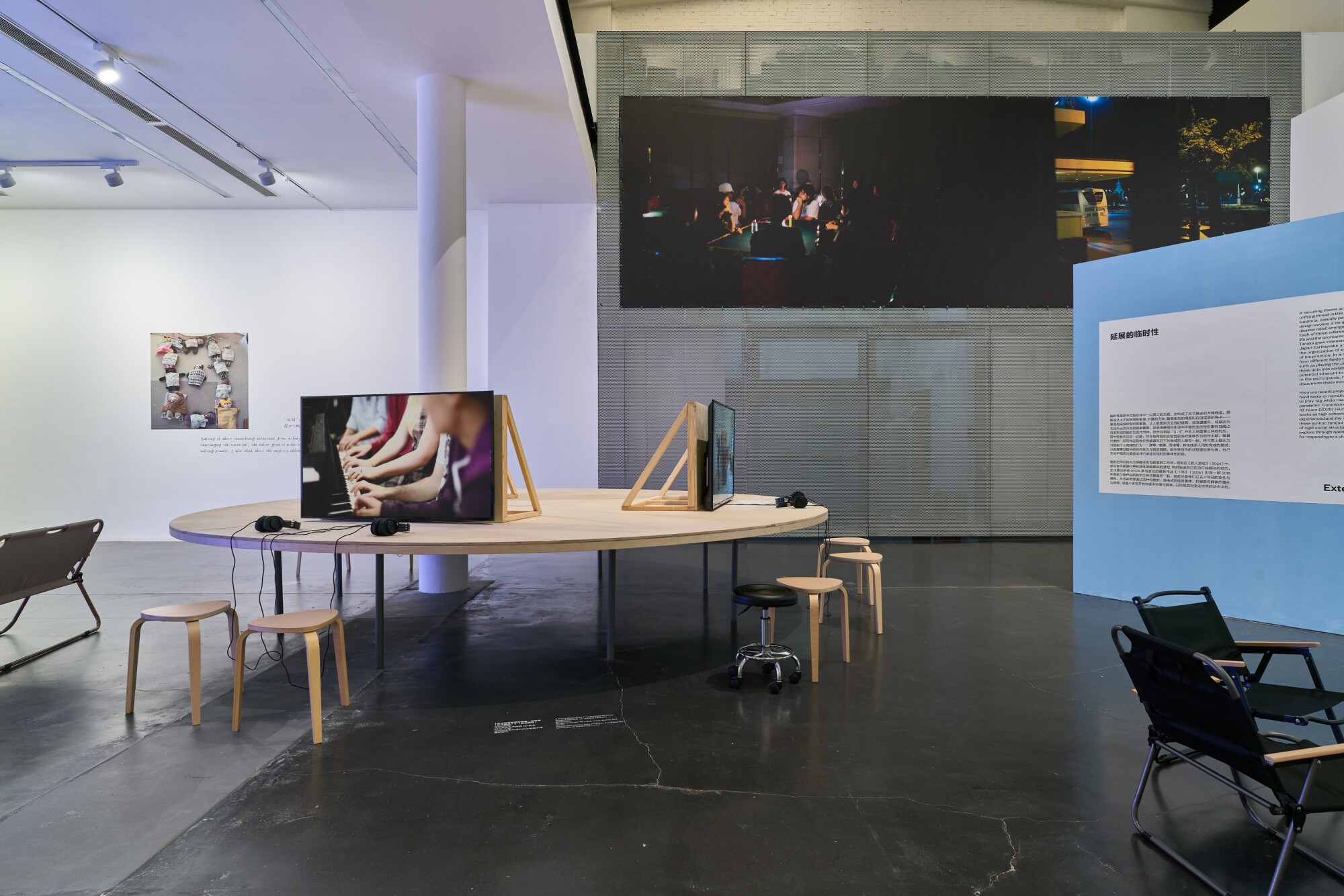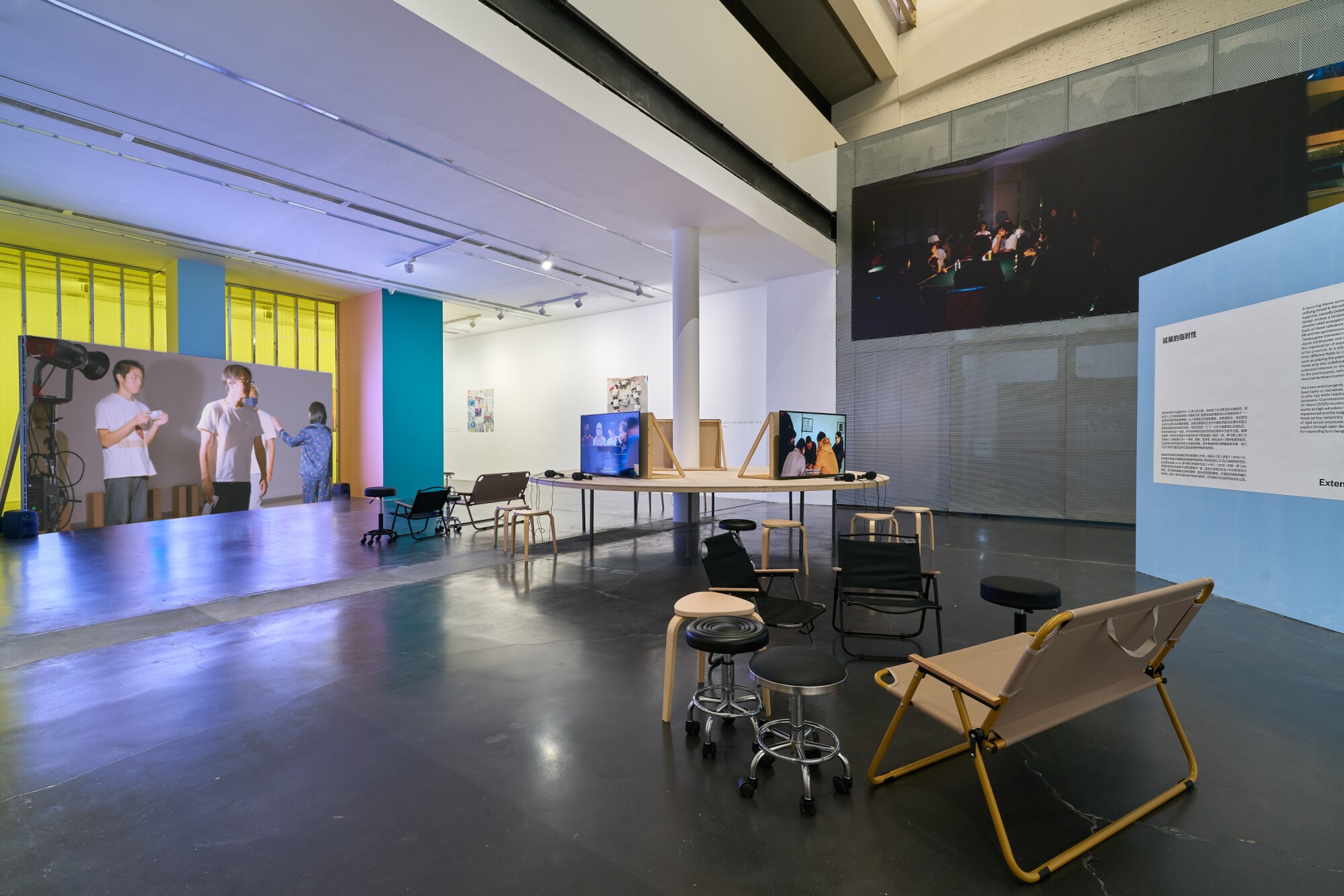 本次展览在空间设计上也延续了“临时共同体”的主题。作品的屏幕不依附于固定墙体,而是被安置在简易木质结构上;展厅中散落的椅子可被观众自由移动。观众因而可以在观看过程中随意调整观看视角,或即兴地自发聚集,或独自停留。空间的开放性与不确定性,使展览本身也成为一个不断生成、又随时可能瓦解的“临时共同体”。
