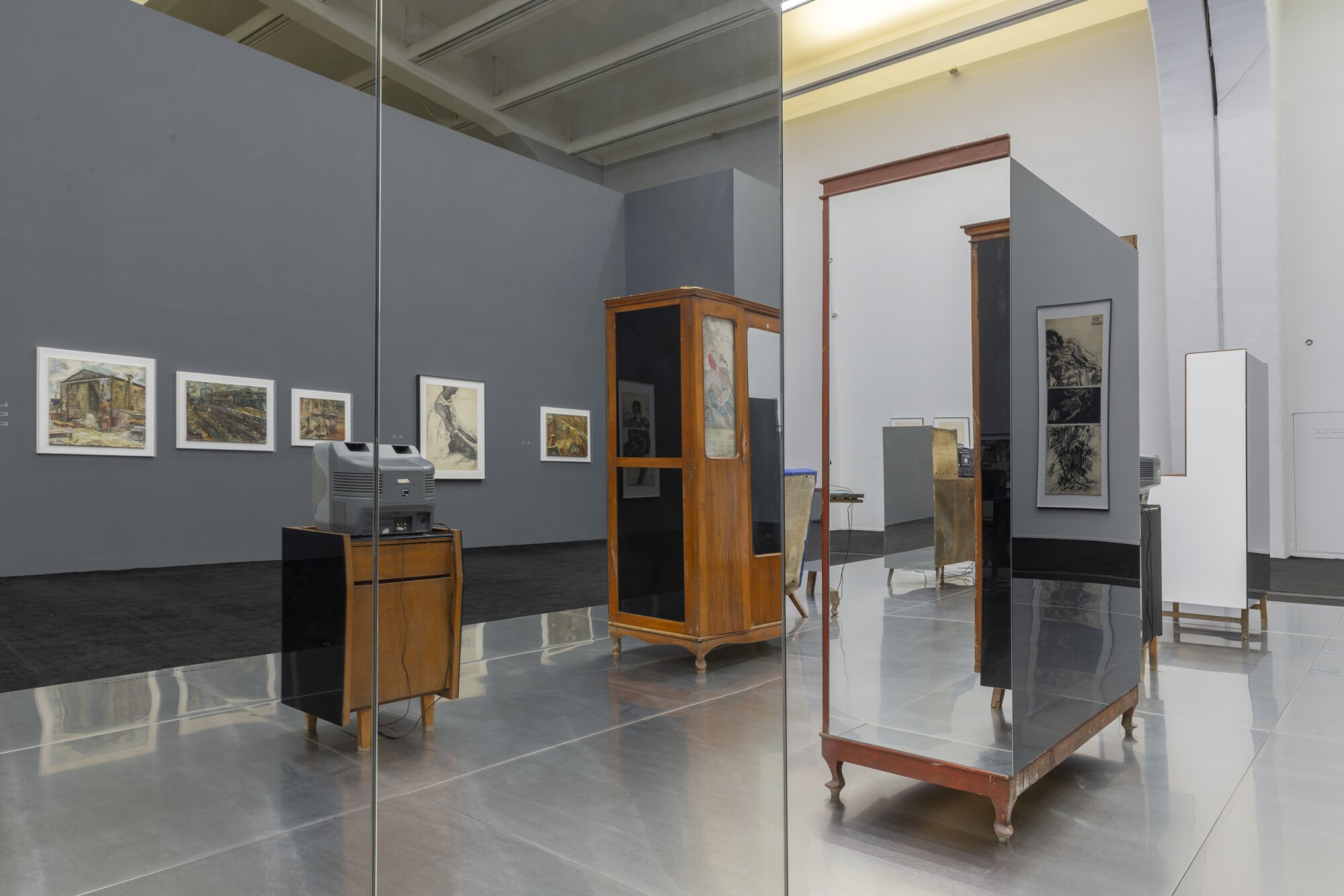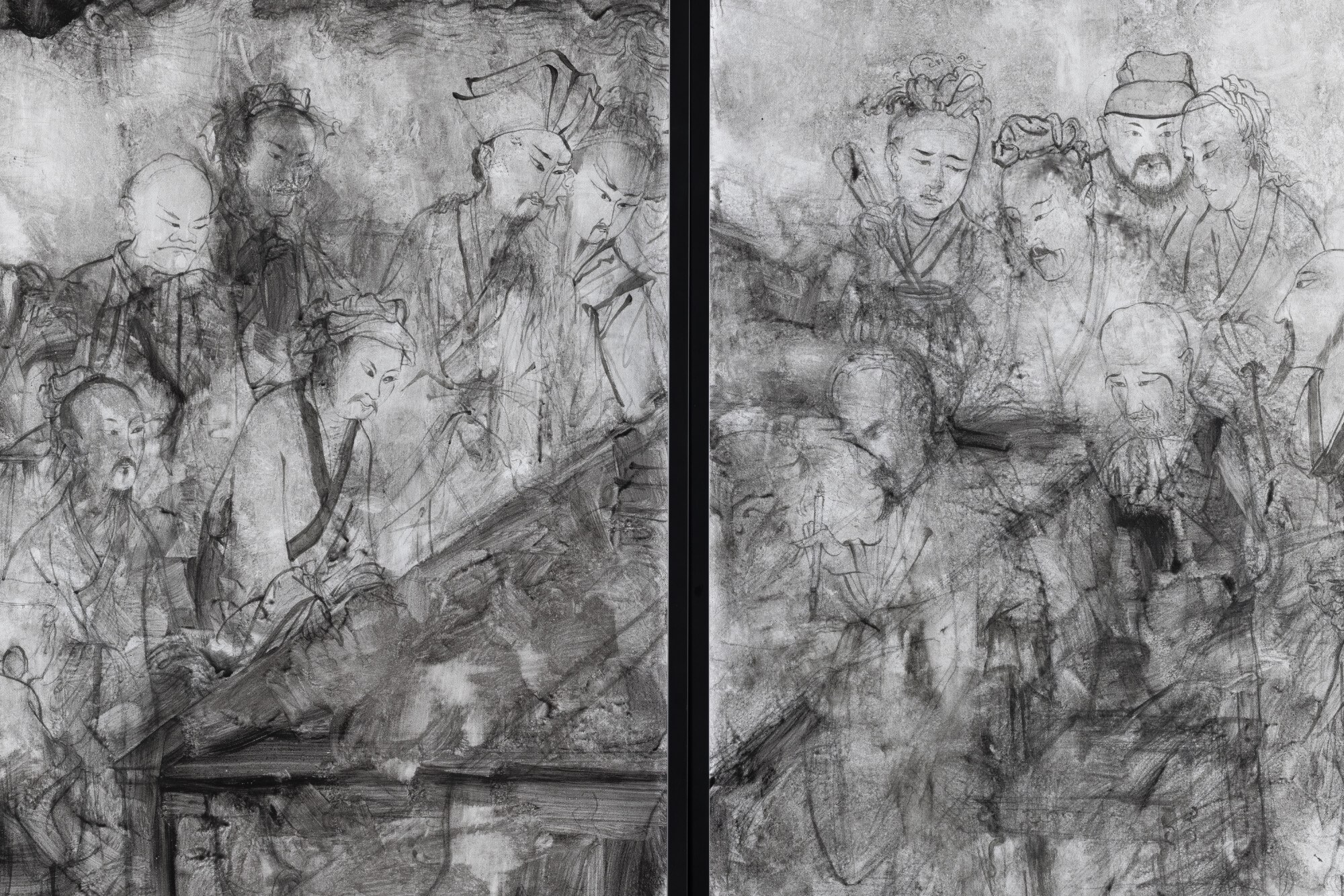 此外,本次展览还呈现多件跨媒介绘画与装置作品:《乐郊私语》(2025)是一组15联绘画装置,灵感源自南宋画家马远的长卷《西园雅集图》,艺术家结合极具个人风格的图式语言,以文人“出行”的意象与展厅另一端那座如迷宫般、难以走出的“香河”村庄呼应。断续的画面对应了长卷绘画需逐段展开的观看方式,也宛如被切分却接连的电影镜头,是艺术家对其“绘画电影”概念的又一次探索。装置《哺乳期》(2025)的主体部分由上世纪80至90年代香河地区常见的旧家具和旧电视机组成,真实的影像记录让私人记忆延伸至具身空间。家具被不同明暗度的镜面和玻璃覆盖,观众仿佛置身于一个如园林般幽微、时间失去坐标的流动空间。而旧电视机中播放着2000年初艺术家从上海回到香河老家拍摄的真实生活记录的影像,这些未经布置的画面似乎构成了《香河》的某种前身。