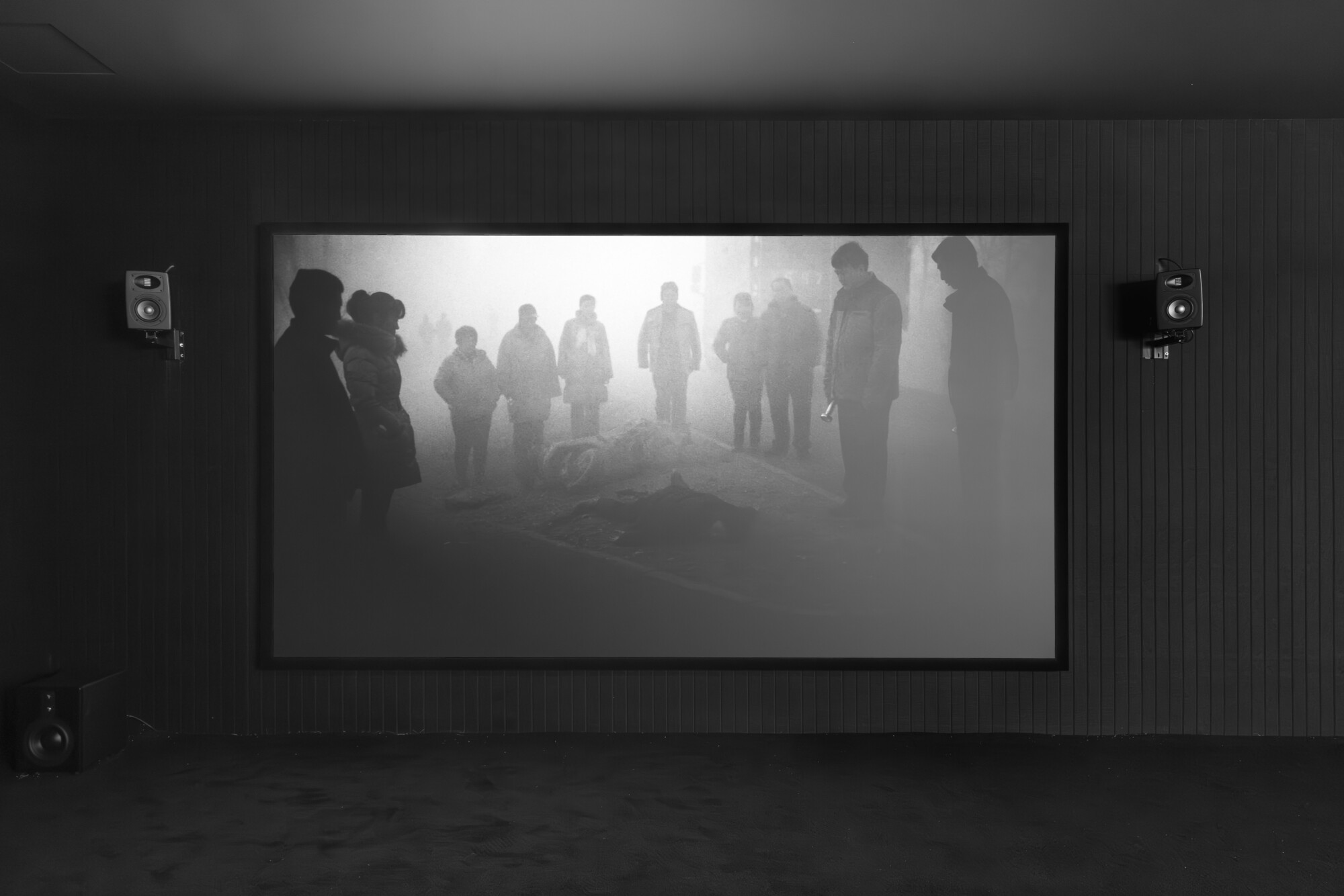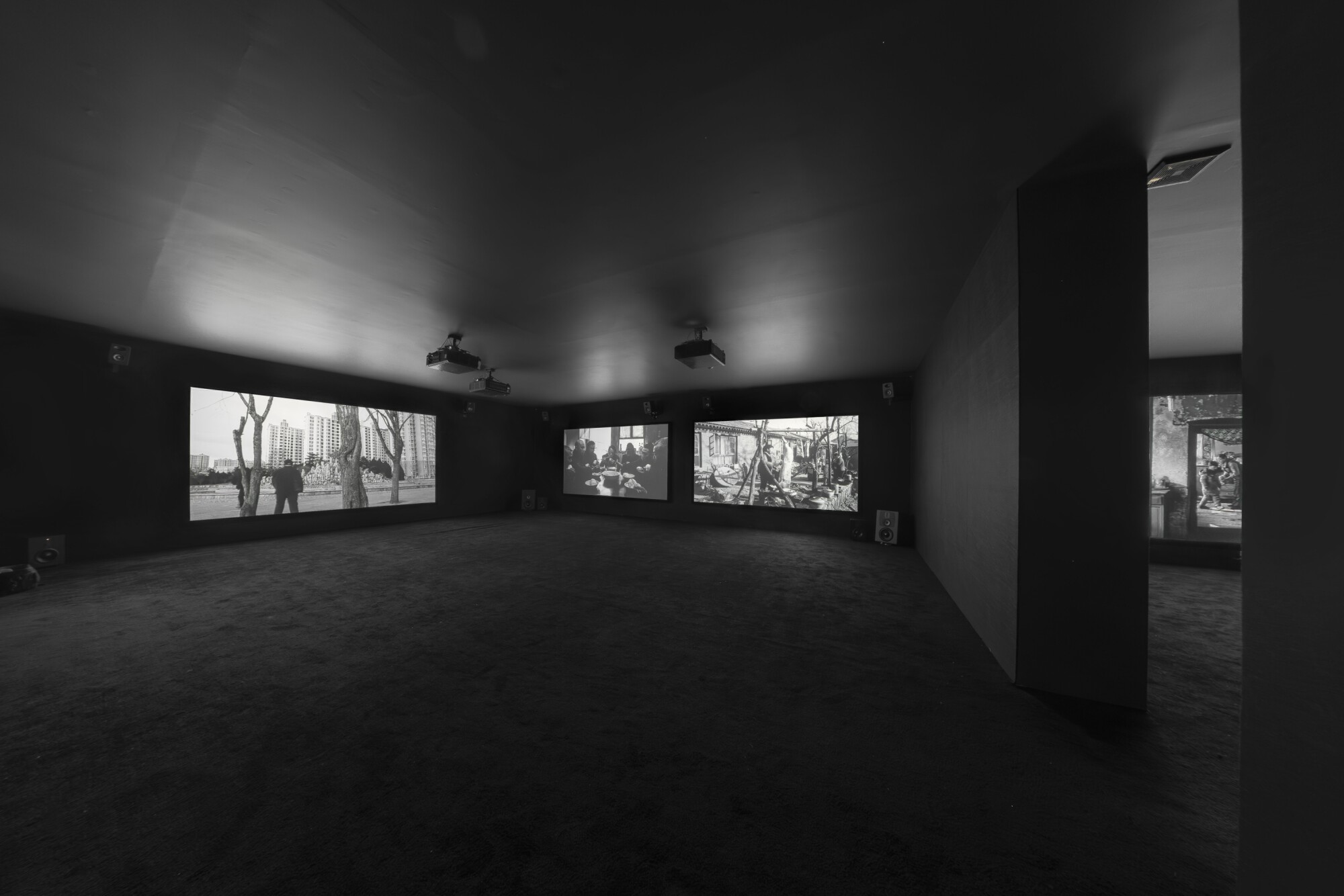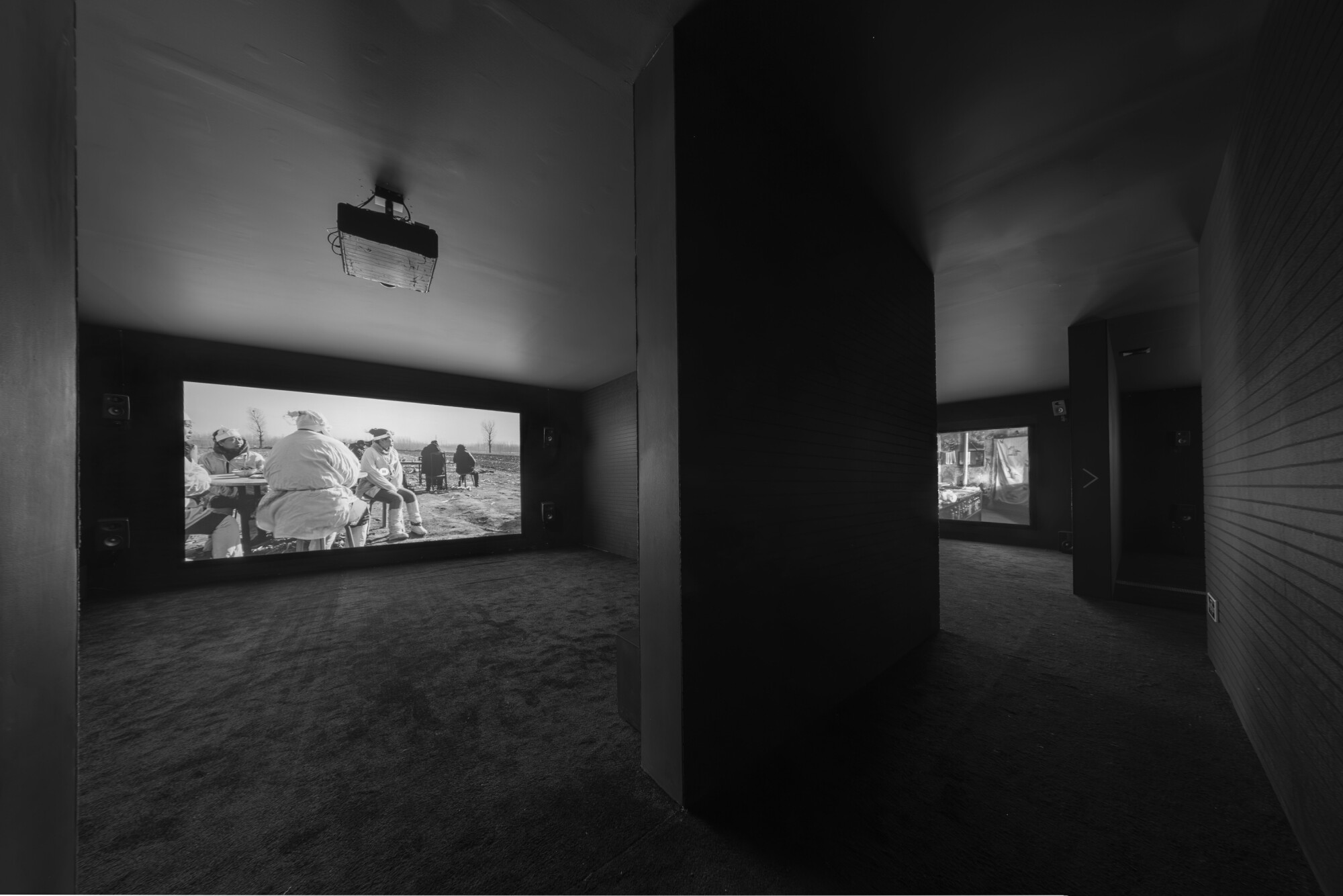 展览标题“香河”取自杨福东的家乡——河北香河县,但在展览中,艺术家却消解了其作为地点的具体指涉,将之抽象为一则交织着私人情感、集体记忆与历史时间的隐喻。作为展览的核心作品,15频黑白影像装置《香河》(2016-2025)凝聚了杨福东超过二十五年的构思与创作。早在1997年拍摄完首部长片《陌生天堂》后,艺术家便萌生了以家乡为灵感的创作念头。2016年,他带领团队在香河县城与附近村庄辗转拍摄了47天,直至2025年秋才完成后期制作。作品以一位年轻母亲在村中筹备春节庆典的日常情景展开,其间穿插着生老病死的碎片化情节与日常的劳作场景,呈现了北方乡村生活在光影流转下既真实又陌生的面貌:人们在日复一日的劳作中度量时间的流逝,而那些偶然闯入的超现实场景,如同梦境的缝隙,打开了另一重时间维度。