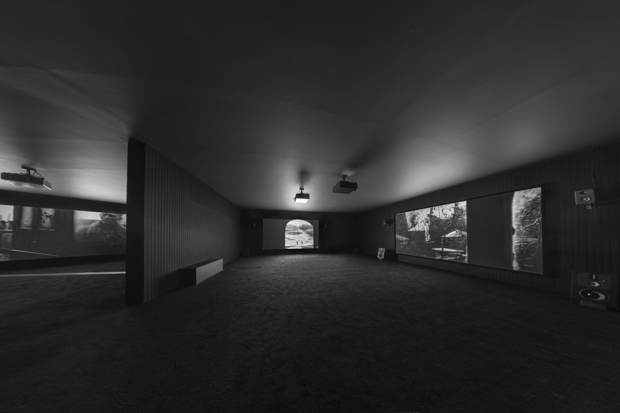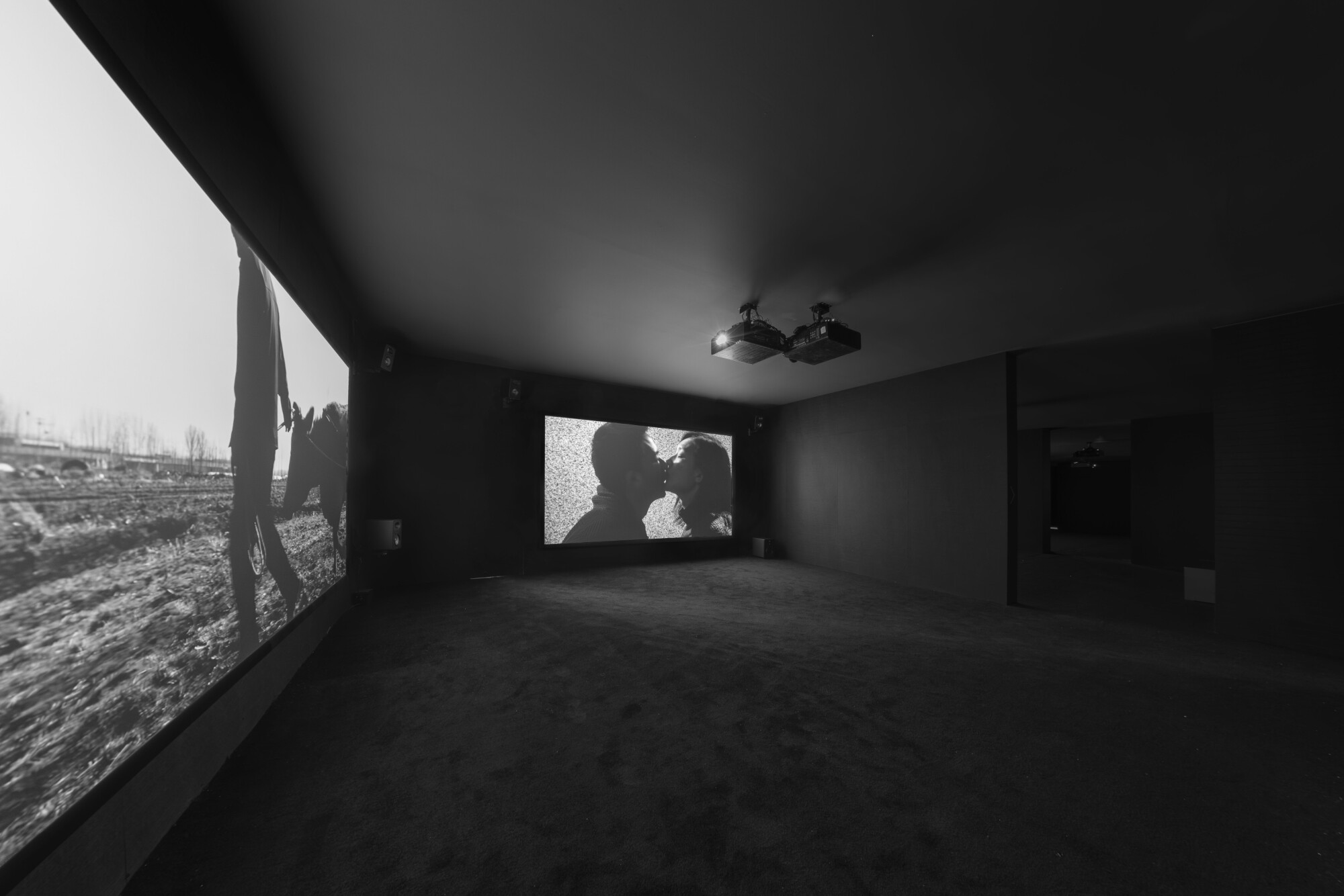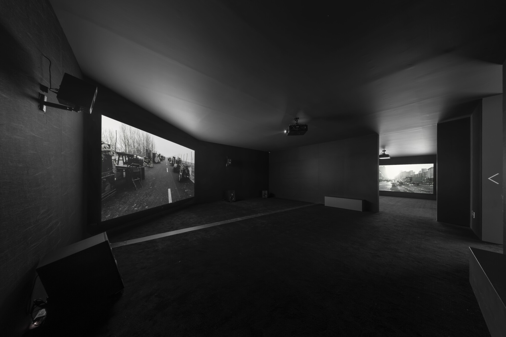 展览空间以“迷宫”“城楼”“广场”等多种象征性空间形态为结构,配以黑白与多层次灰色调,形成既具秩序感又充满诗意的场域。此外,艺术家拒绝设定单一的观展路线,通过多通道与多向的空间布局,让观众在展厅中或徘徊、或折返,甚至迷失方向,仿佛没有固定的起点与终点。光线的运用强化了这种错位的体验,使影像叙事与空间叙事共同指向一种模糊而多维的身体感知。本次展览空间由UCCA展览部杨翛然设计。