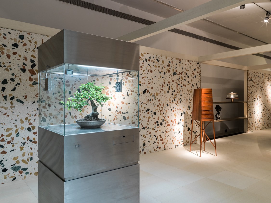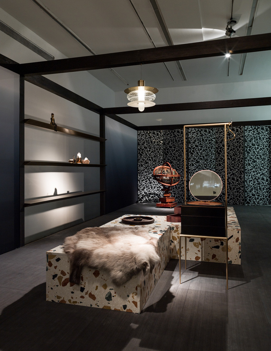 “Broached Retreat” situates these collections within a new context: a pavilion constructed out of fabric and stone. The pavilion consists of a masculine study and a feminine boudoir. The rooms are conceived as meditative refuge, featuring works that address the question of how we experience private, interior spaces today. A few new works are being created to fit with the show’s pavilion context. A day bed and stools are being made from the Dzek Max Lamb Marmoreal terrazzo stone. A giant loom containing a weaving by Susan Dimasi of MaterialByProduct and a dressing table by Chen Lu are being designed especially for the UCCA exhibition.