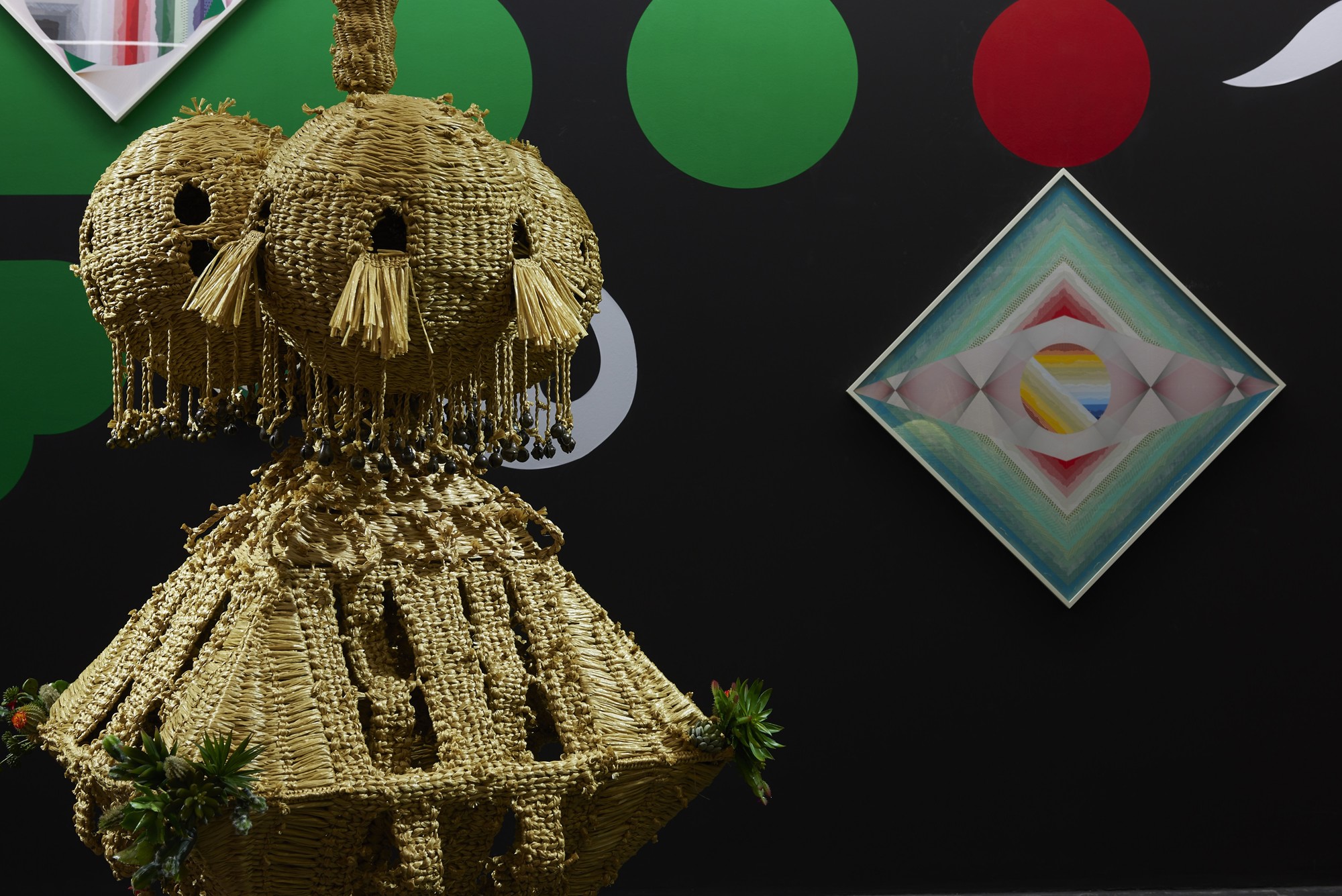 These accumulated anthropomorphic features can also be found in the new sculptural group The Intermediates (2015) and the wallpaper series Eclectic Totemic (2013)—completed with London-based designer duo OK-RM (Oliver Knight and Rory McGrath)—situated in the Central Gallery. Titled "The Sun and the Moon: The Golden Crow and the Jade Hare," the floor is drawn according to a spiral pattern found in Oskar Schlemmer's Triadisches Ballett (1922), the straw figures of The Intermediates, adorned with a Korean bridal headpiece, vintage Indian cowbells, and artificial succulent plants among other things, ‘dance’ in a whimsical ritual allowing an experiential shift in their assumed objectivity.