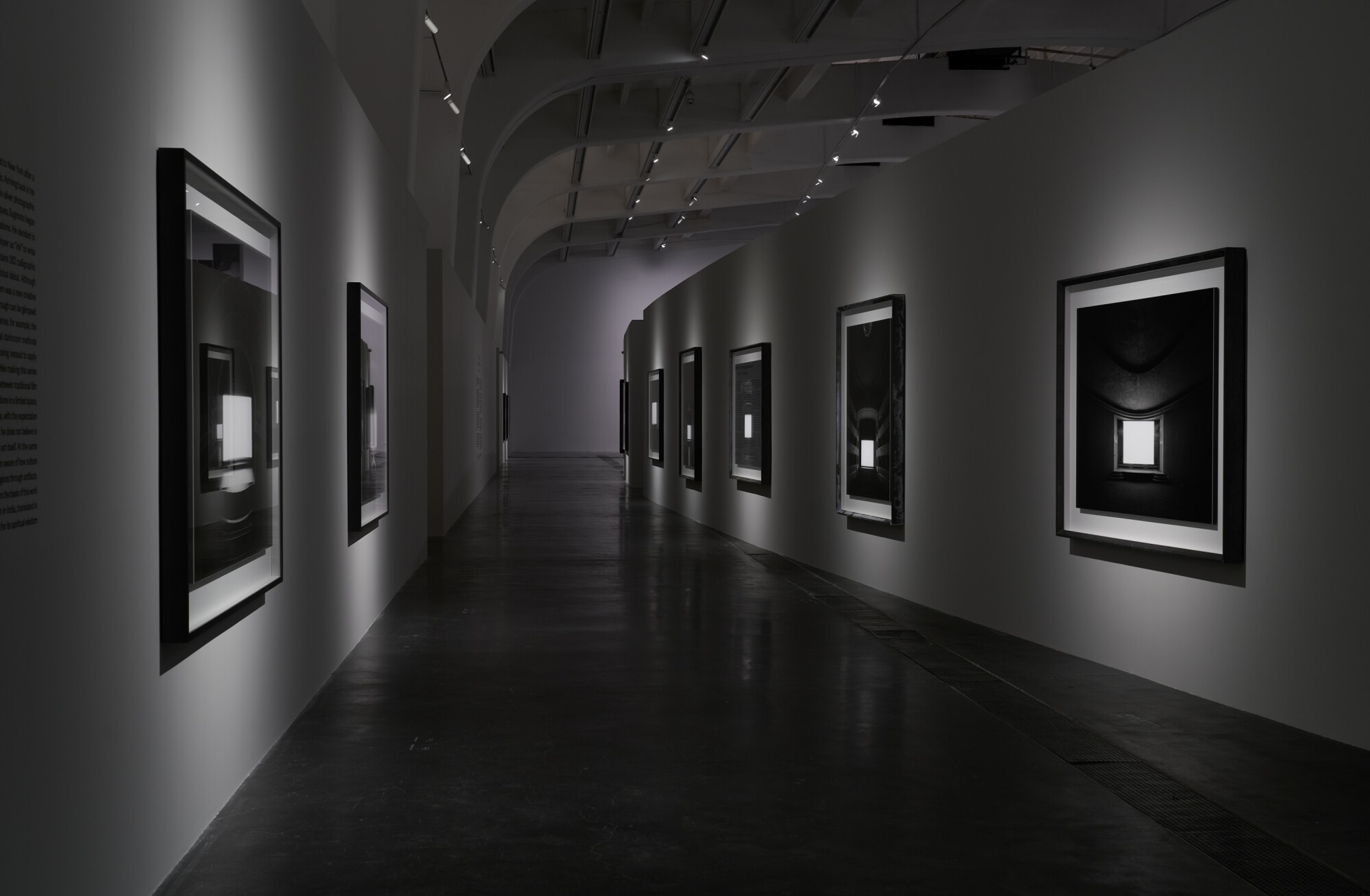 Walking into the Great Hall, visitors will first see the “Theaters” series that took Sugimoto over 40 years to complete. This series began in 1976: shooting inside movie theaters, Sugimoto set the exposure time to match the length of the film, effectively compressing thousands of frames into a single still image. The brilliant white screens resulting from the long exposure embody the collectivist and spiritual aspects of movie-going. From 1976, Sugimoto continued to explore creative ways of using long exposures in a variety of cinematic and theatrical settings: the “Drive-Ins” series captures light trails of planes and stars behind outdoor screens; the “Opera House” series witnesses the grandeur and immortality of European opera houses that have withstood the test of time; and the “Abandoned Theaters” series reveals the gradual desolation of classic American cinemas due to technological advancements. Sugimoto chose to use lead frames for his “Opera House” and “Abandoned Theaters” photographs, reflecting the passage of time depicted in the images themselves through the patination process.