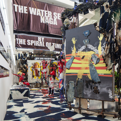 The fourth film, Painting with history in a room filled with people with funny names 3, further situates the artist's work within a unique cosmology, indoctrinating viewers with his rap star vernacular of philosophical musings on enlightenment. Heaven and Hell become diametrically opposed interpretations of a world created from the feedback loop of experience and synchronous digital documentation. A motif repeated throughout the film and carried over into the works of the Nave, the "search for Naga" is not simply a reference to an exotic symbol but an allusion to the pan-cultural Ouroboros, an eternally returning cycle representing his practice.