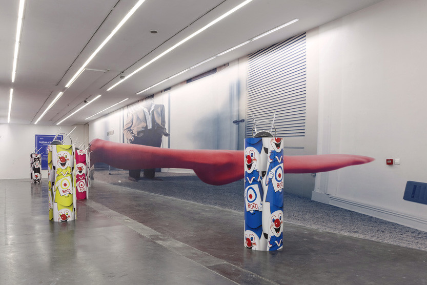 Kathryn Andrews’ (b. 1973, Mobile, Alabama) conceptual sculptures question the nature of authorship, the histories of objects, and the instability of the art experience. Her three-dimensional works juxtapose Minimalist chrome structures with readymades such as movie props and other kitschy, L.A.-specific signifiers, exploring the psychological transference of seeing these objects as art and vice versa. By delegating the manufacture of her artworks, Andrews also undermines public expectations of the artist’s touch, itself a commodity within the art market. For her UCCA presentation, Andrews will display a series of aluminum barrel sculptures covered with vinyl prints of the iconic American children’s character Bozo the Clown. The Bozo franchise began in the late 1940s, and anyone can buy the rights to use his likeness, as Andrews has. Her exhibition will also include a large-scale wallpaper pieceof the iconic seduction scene from the 1960s film The Graduate, recreated and photographed in the artist’s studio. In tandem, Andrews’ works explore issues of authorship, originality, and iconography, how appropriation and recontextualization distort the experience of image-symbols.