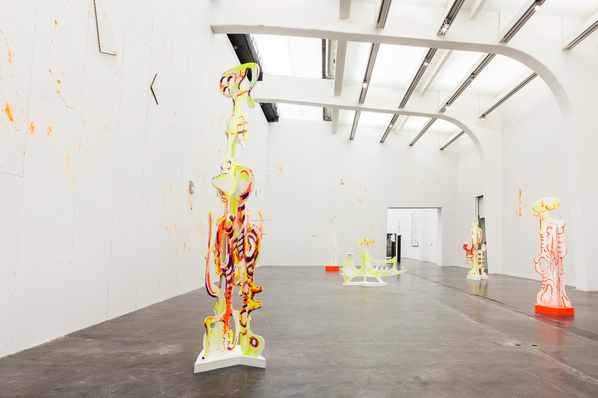Aaron Curry (b. 1972, San Antonio, Texas) creates large-scale, biomorphic sculptures in aluminum and wood as well as painting and collage works. The chopped forms that compose his sculptural works are often left roughly cut to preserve the trace of the artist’s hand, and many are spray painted in bright, lurid hues. His pieces are inspired by comic books, science fiction, graffiti, punk, and other subcultures, extending and disfiguring pop aesthetics into near abstraction evocative of surrealists like Max Ernst and Juan Miró. Many of his sculptural and two-dimensional works also incorporate found images—movie posters, popular magazines, and media stills—which further complicate his works negotiation of high and low aesthetic forms. Curry’s UCCA presentation comprises 5 of his iconic, quasi-figural sculptures within an exhibition space covered in 238 sheets of cardboard. On these panels are configurations of orange paint, shoe prints, and found objects that echo the gestural forms of his sculptures. Two large-scale sculptures from the collection of the Fondation Guy & Myriam Ullens will be installed in the UCCA Lobby.