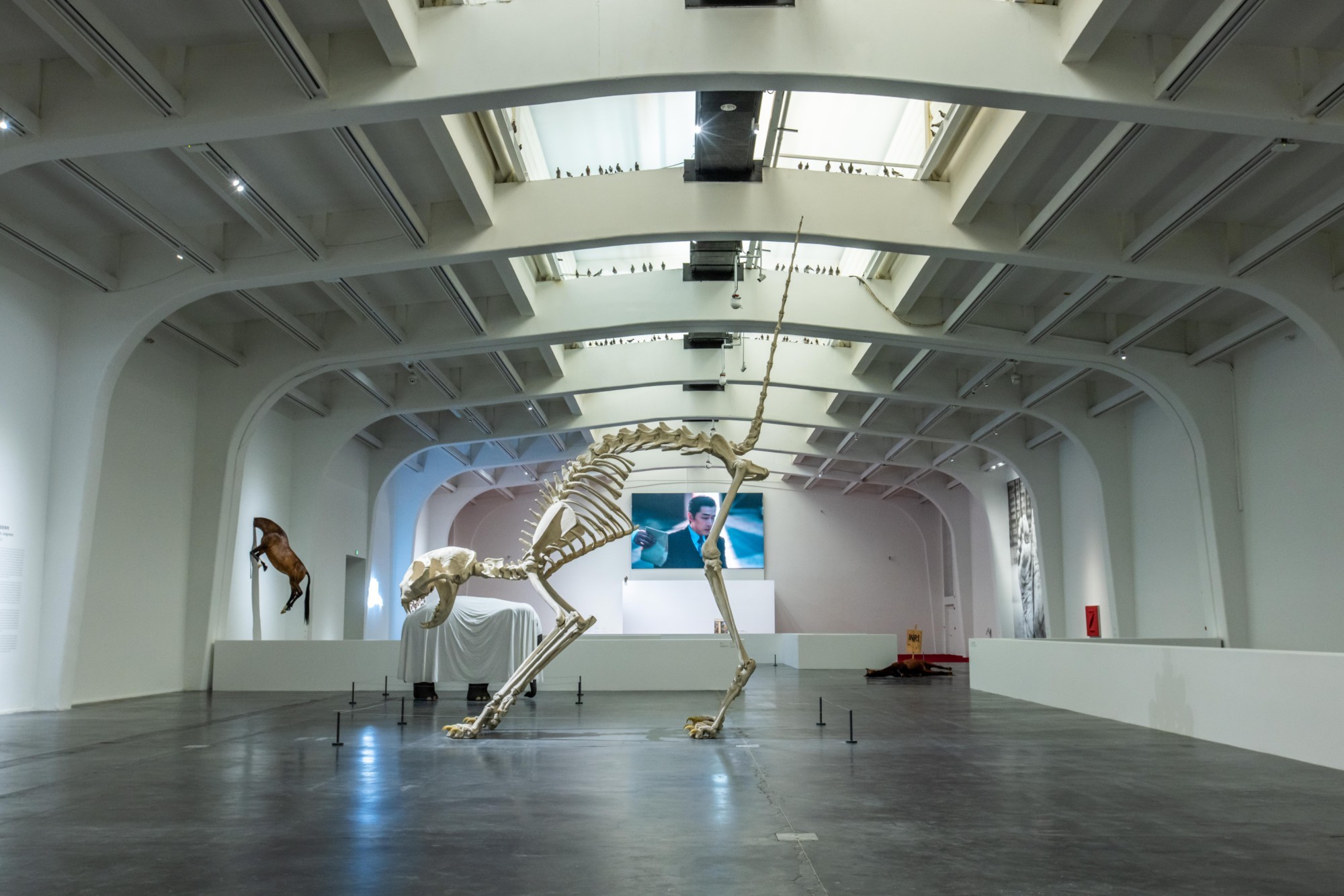 On view within the open space of UCCA’s Great Hall are 29 works of installation, sculpture, and performance works from throughout the artist’s career, including his first major work Lessico Familiare (1989) and the well-known Catttelan (1994), Bidibidobidiboo (1996), Novecento (1997), and Comedian (2019), along with a suite of animal taxidermy works. Site-specific works—such as Zhang San (2021), a sculpture outfitted as a homeless person in Beijing, and a performance piece based on the figure of Picasso that also alludes to UCCA’s 2019 exhibition “Picasso – Birth of a Genius”—prompt viewers to participate in Cattelan’s artistic exploits within the contradictions of contemporary society, along with his interrogation of the culture and stereotypes of his birthplace, the mores of today’s globalized society, and the contexts surrounding such reflections.