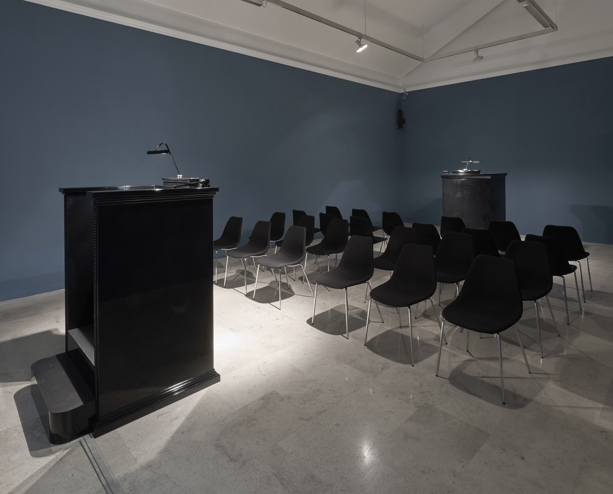 Elmgreen & Dragset employ the entire installation of The Well Fair to reflexively examine the physical and conceptual makeup of contemporary art fairs. By mimicking the now commonly accepted grid layout of an art fair and utilizing this as the display format for the exhibition in the museum's main hall, the artists also probe the ease with which behavioral patterns are adapted from one particular setting to the next. Visitors to the fair will navigate the space by passing from one aisle to another, discovering different scenarios in each booth and encountering museum personnel engaged to act as the fair's staff. Elmgreen & Dragset displace the kinetic potential for commerce, situating the fair in a state of limbo without any clear indication of start or finish, and by filling the fair with only their own works, they eliminate the typical aspects of competitive valuation between artists. This fictional setting seeks to break down the social hierarchy usually present at commercial art fairs, with nothing actually for sale and a VIP lounge that remains inaccessible to all. Issues of value and originality are perhaps most clearly addressed in two identical, adjacent booths in which every element on display is doubled, including all of the art pieces, the furniture and even the gallerists, performed by identical twins. Expanding upon the doubled geometry, Secondary (2015), an auction room mirrored from the center with rows of chairs and one podium at each end, is installed in the center of the fair, accompanied by a cacophonous soundtrack of two auctioneers collecting bids.