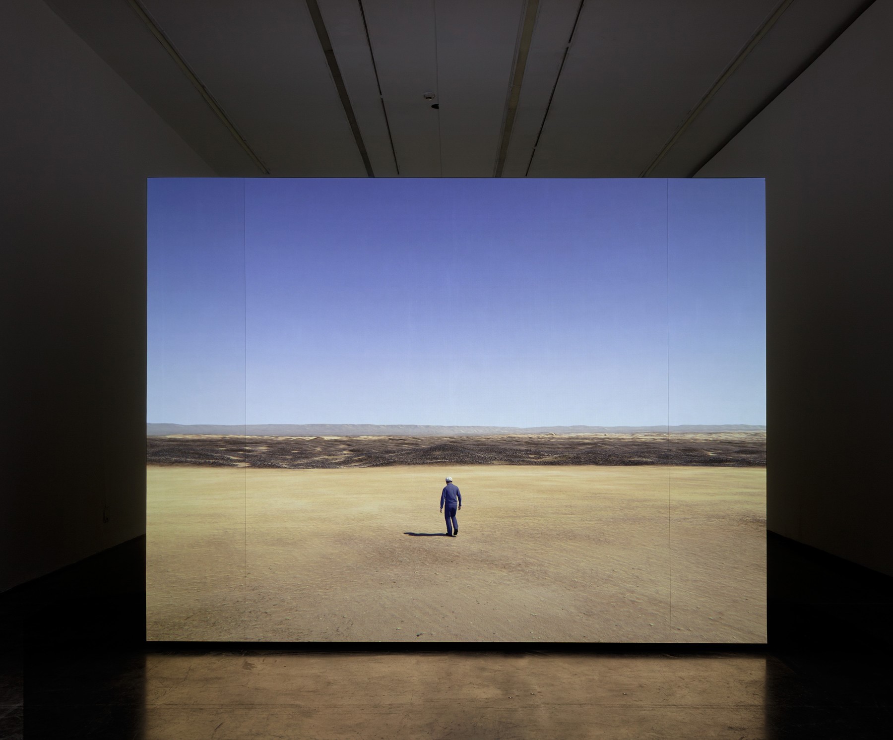 在位于甬道入口的《太阳能储备,内华达州的托诺帕,2014》中,杰勒德刻画了虚拟世界中由一万面镜子组成的巨型光雕塑,呈现莫哈韦沙漠中的发电厂。作品中出现的事物均基于现实世界中的原型,它们以三维设计软件绘制而成。游戏引擎是杰勒德的重要创作媒介,其作品则作为软件而输出,制造实时的非持续性无框影像。这一后电影式的影像媒介随着“太阳能场”的60分钟轨道而移动,象征人类对太阳运动规律的依赖与拒斥。