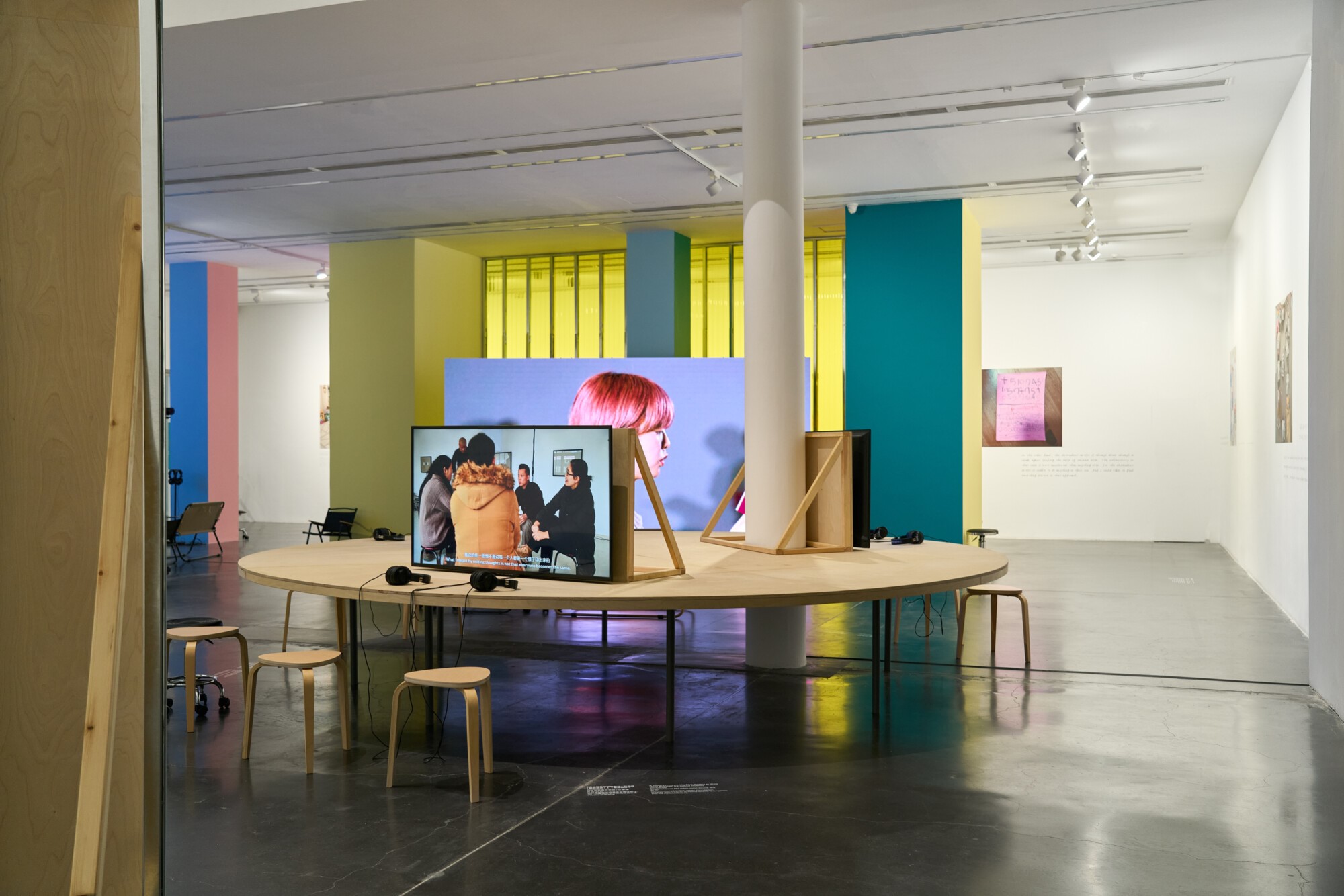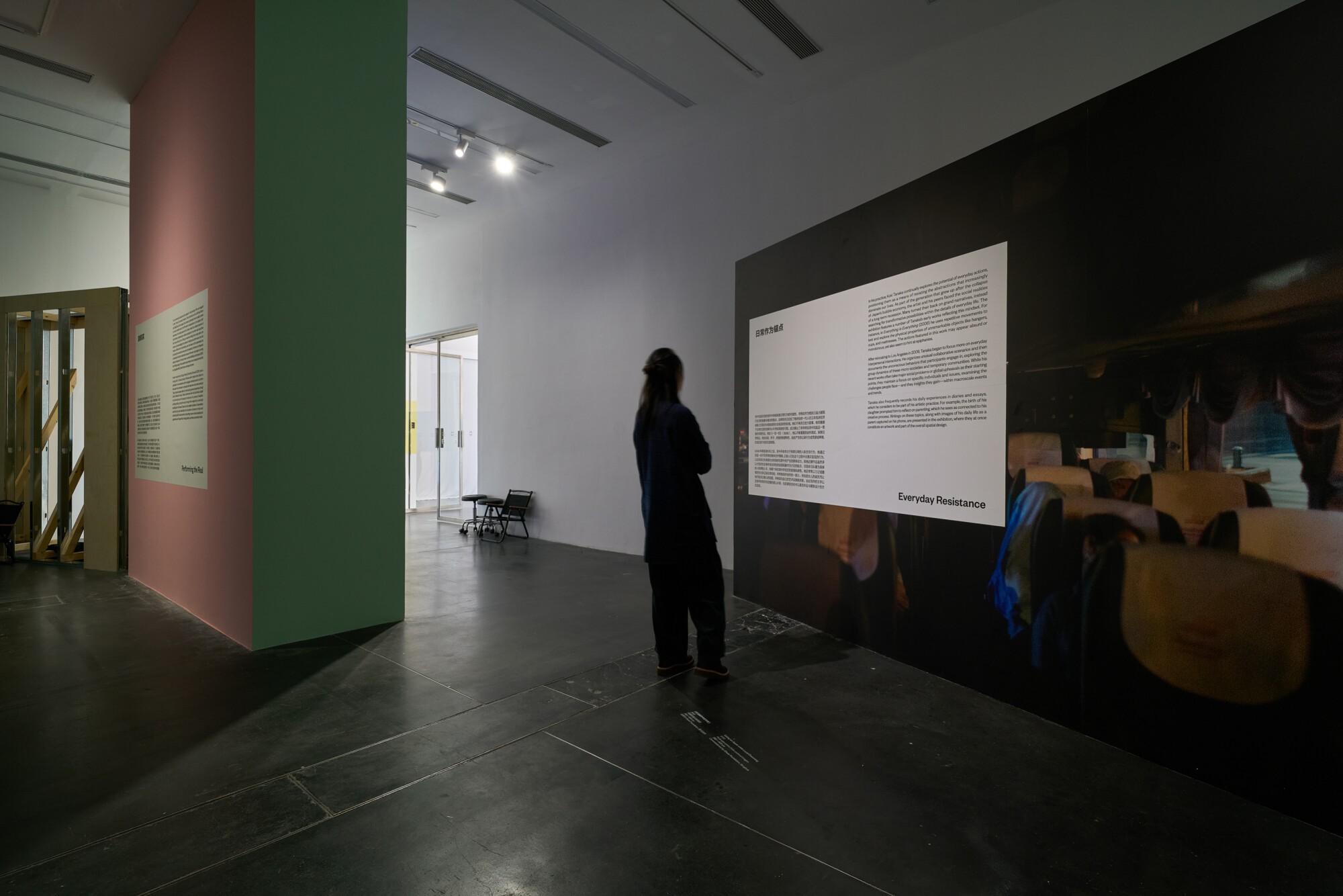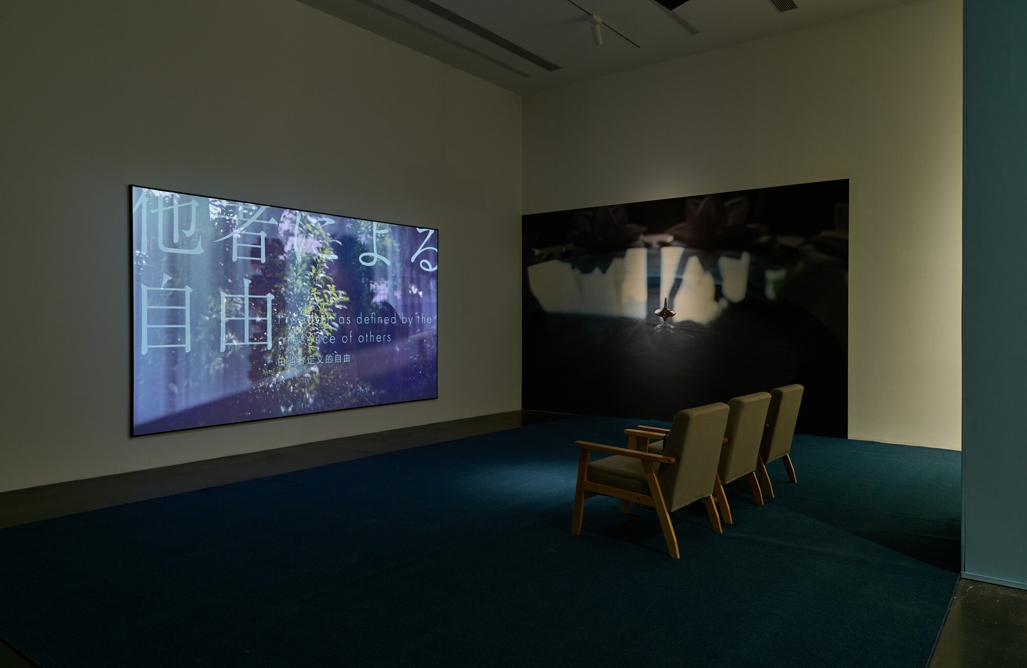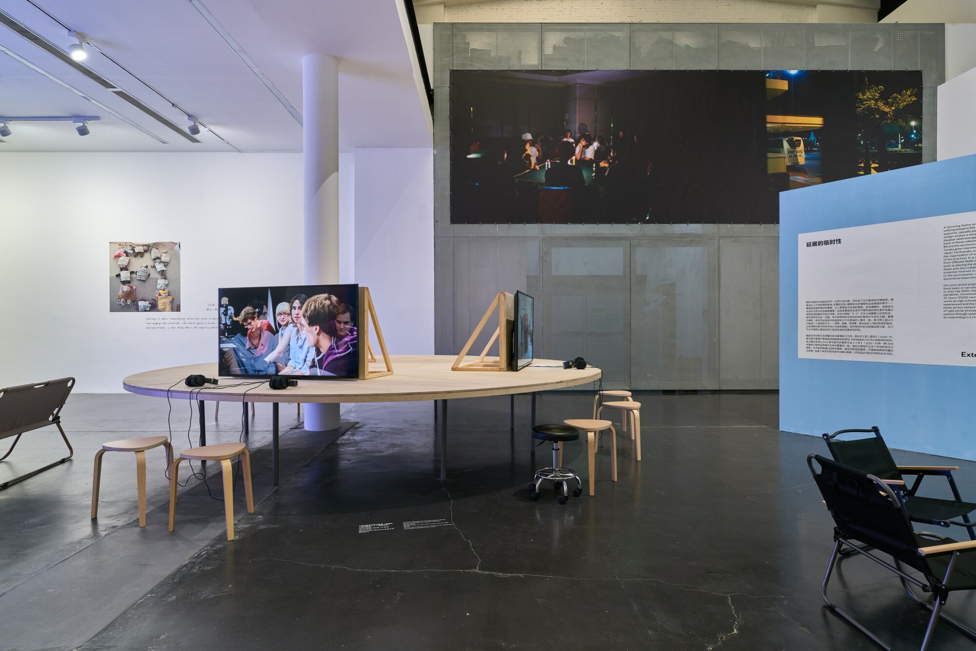 本次展览在空间设计上也延续了“临时共同体”的主题。作品的屏幕不依附于固定墙体,而是被安置在简易木质结构上;展厅中散落的椅子可被观众自由移动。观众因而可以在观看过程中随意调整观看视角,或即兴地自发聚集,或独自停留。空间的开放性与不确定性,使展览本身也成为一个不断生成、又随时可能瓦解的“临时共同体”。