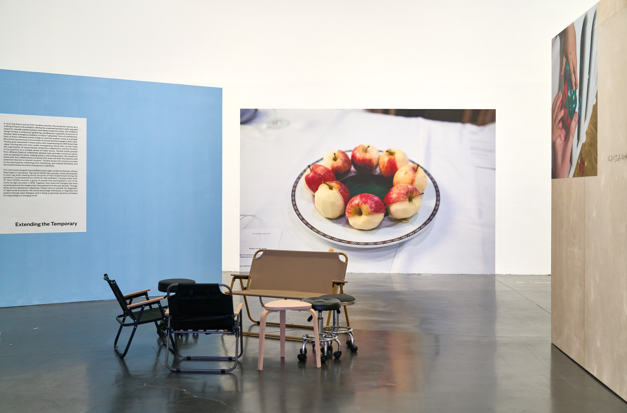 临时性是田中功起创作中一以贯之的主题,也构成了此次展览的关键线索。展陈设计上不加粉饰的板墙、外露的支架、随意张贴的海报和自由摆放的椅子——像是构成某种暂时的聚集,让人联想起灾后临时建筑、应急避难所,或是因为无法外出而衍生的居家露营。这些场景指向生活中不期而至的危机事件及随之自发形成的临时互助共同体。经历过例如“3·11”日本大地震等公共危机后,田中愈发关注这一议题,并开始将组织实验性的临时集体作为创作主题。最具代表的一系列作品是他分别邀请来自不同领域的人聚在一起,将习惯上被认为只能由个人完成的行为——弹琴、制陶、写诗等,转化成多人同时完成的尝试,以此探索过程中的协作张力与创造潜能。田中将创作的过程留给参与者,自己不去干预而只是促成并记录这些临时的集体性时刻。