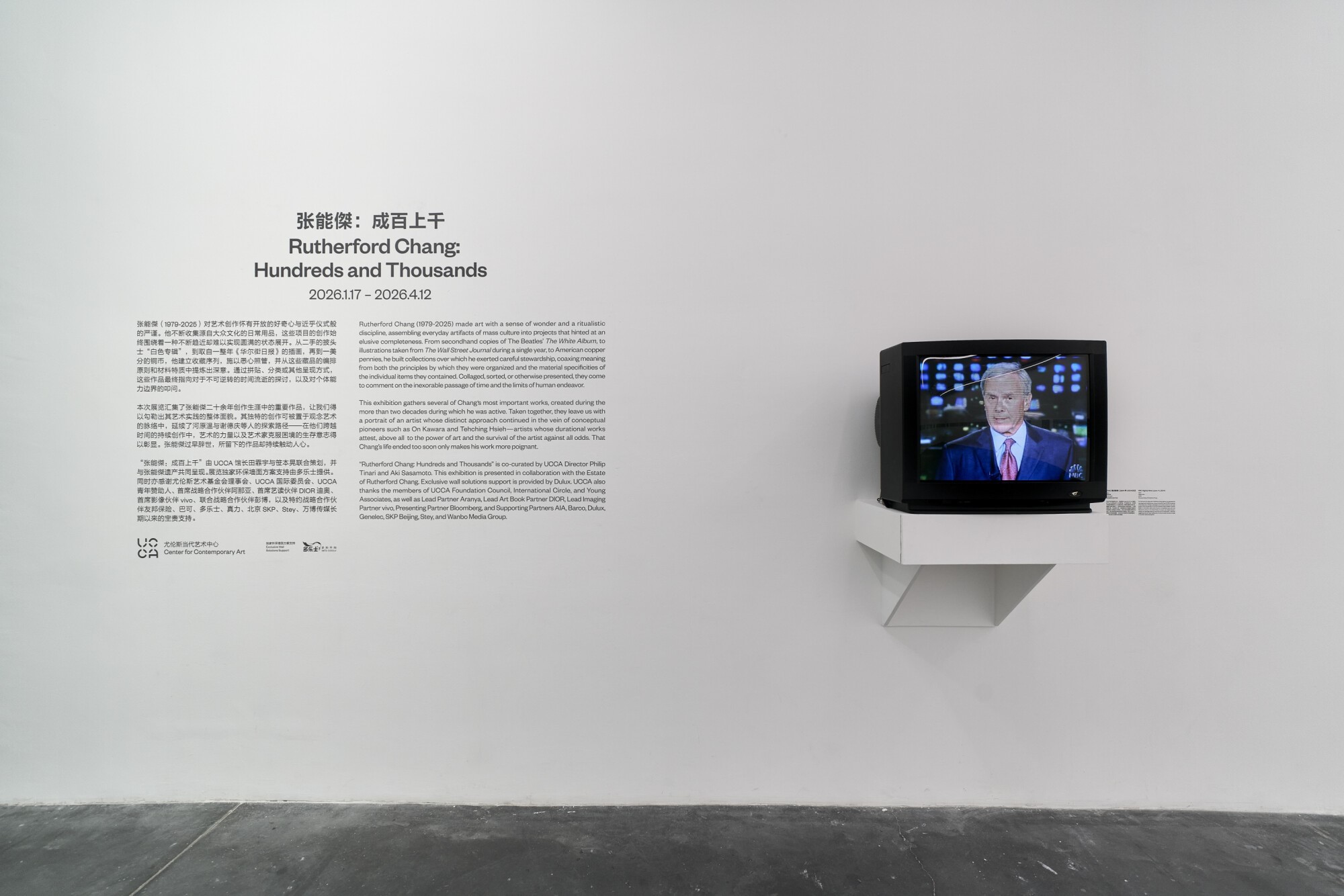 本次展览独家环保墙面方案支持由多乐士提供。同时亦感谢尤伦斯艺术基金会理事会、UCCA国际委员会、UCCA青年赞助人、首席战略合作伙伴阿那亚、首席艺读伙伴DIOR迪奥、首席影像伙伴vivo、联合战略合作伙伴彭博,以及特约战略合作伙伴友邦保险、巴可、多乐士、真力、北京SKP、Stey、万博传媒长期以来的宝贵支持。