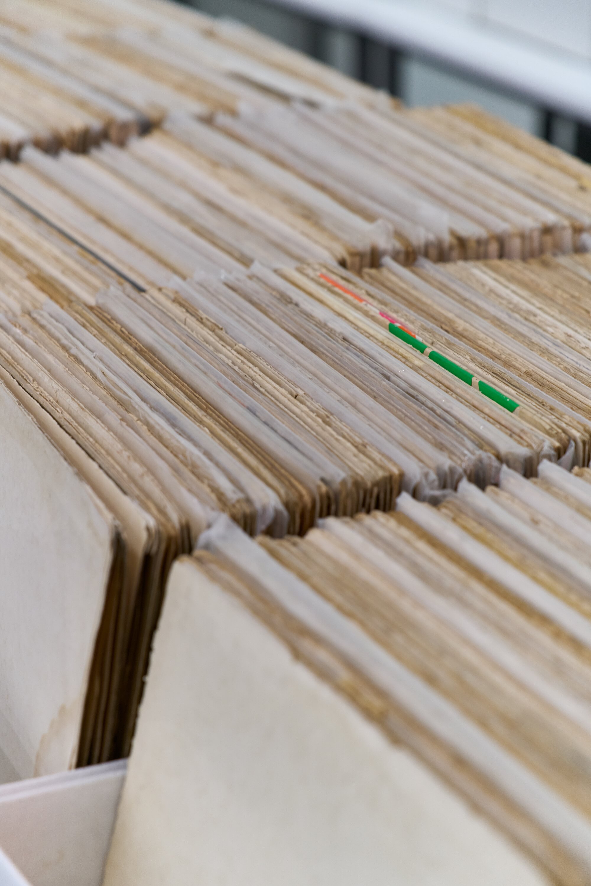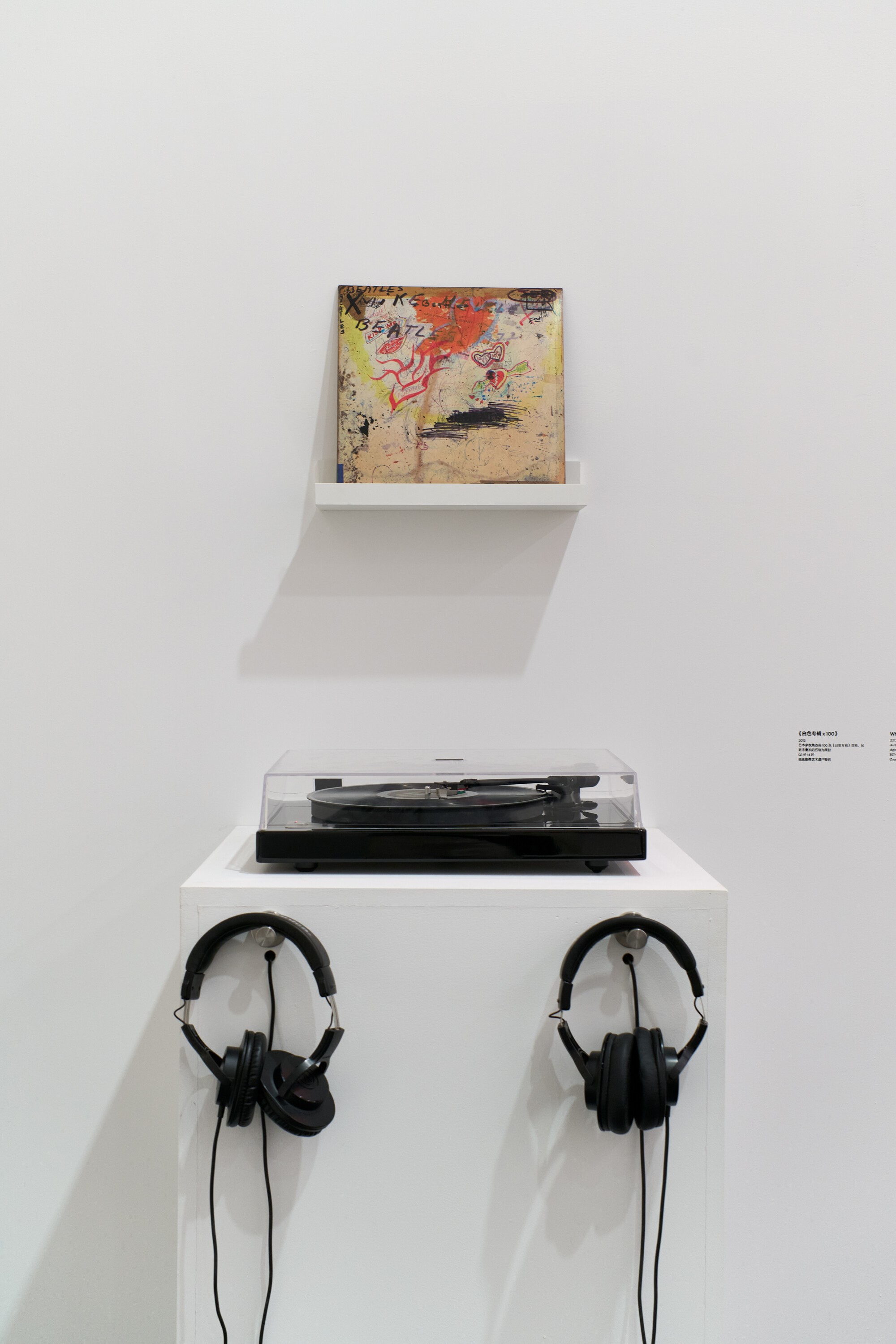 展览的核心作品之一《我们收购白色专辑》(2006-2025)以不断积累的实物档案的方式展开,乍看像一间唱片店,但其中的唱片并不出售。此作品所收集的皆为英国摇滚乐队披头士1968年发行的同名专辑(即广为人知的“白色专辑”)。这张专辑几近空白的封面由波普艺术家理查德·汉密尔顿和披头士成员保罗·麦卡特尼共同设计,将极简主义美学引入流行文化。张能傑十五岁时购得第一张“白色专辑”,自2006年开始系统性搜寻这张首版唱片,并依据压印的独立编号进行归档;2013年在纽约艺术机构Recess的临街空间首次公开展出这一不断增长的收藏。陈列于此供观众翻阅乃至聆听的唱片,带有注解、污渍及其他磨损痕迹,封套上的随手涂鸦、留言与生活痕迹,构成一部“白色专辑”发行数十年以来的社会史,颠覆了“空白封面”的概念。此外,观众在此还可以聆听张能傑创作的一件声音作品。艺术家将最初收集的100张“白色专辑”的音频叠加,将生成的录音压制为黑胶唱片;唱片上的划痕、表面噪音以及微小的转速差异,使音乐逐渐转化为致密的音响纹理,既凸显了媒介的物质性,亦强调了原专辑音乐中本就存在的实验性色彩。