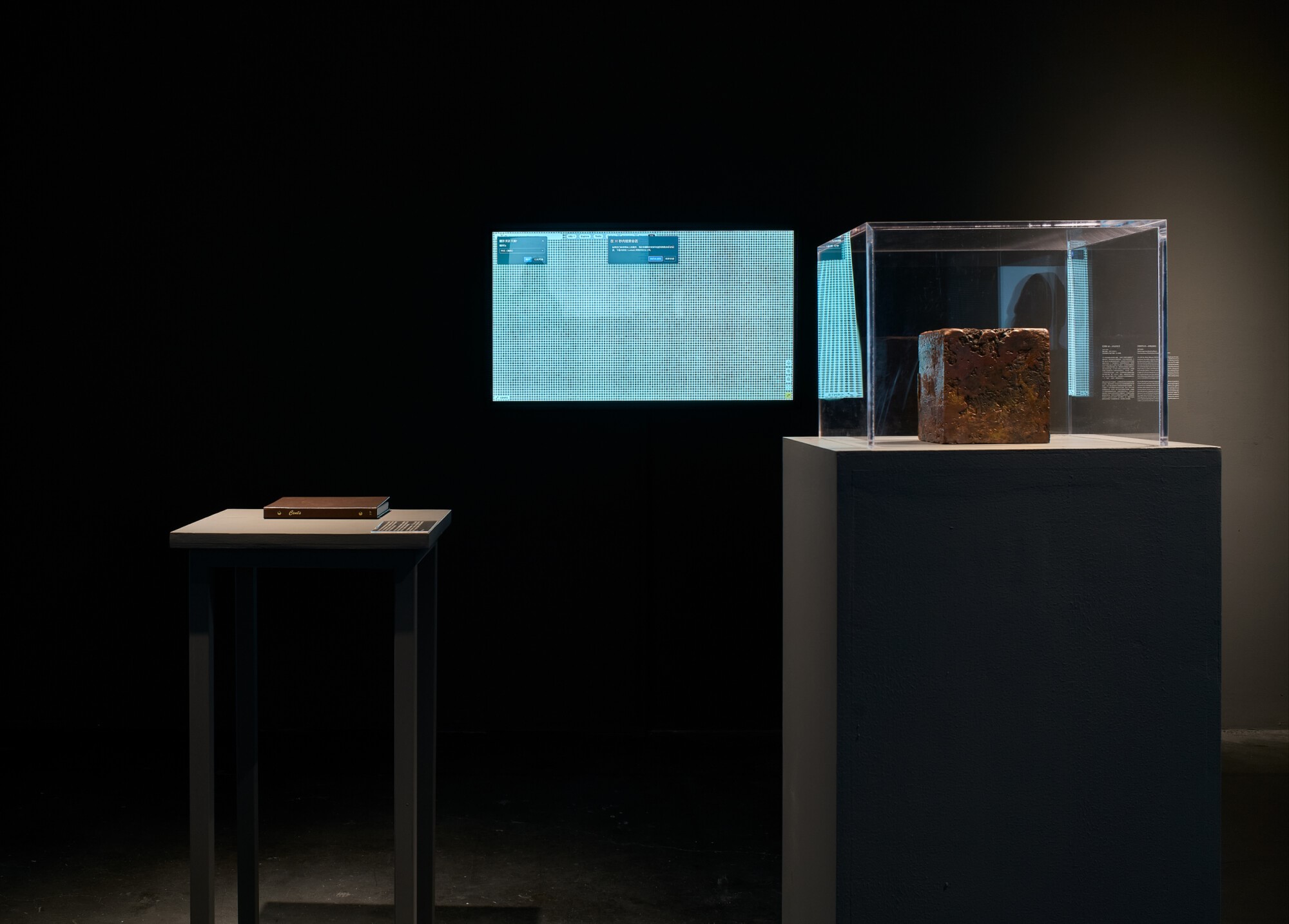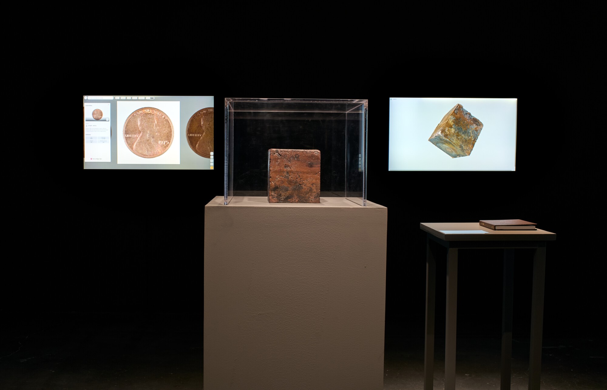 与《我们收购白色专辑》相似,《美分》(2017-2024)亦基于批量生产、看似别无二致的现成品创作,由一万枚1982年以前铸造、因含铜量而具有更高物质价值的美国1美分硬币构成。张能傑拍摄了自己收藏的每一枚硬币的照片,记录其独特的磨损与斑驳,然后将这批硬币熔铸成一块31公斤的铜立方体。原始硬币的图像亦以数字化方式铭刻于比特币区块链上,从而将实体货币的数字影像与虚拟价值体系进行了关联。艺术家以观念性的探索引发我们对时间、永恒以及物质价值评估方式演变的思考。观众可通过触摸屏设备或书籍浏览这一收藏,观察数十年流通在每枚硬币上留下的细微磨损与斑驳。随着实体美分硬币逐渐退出流通(美国铸币局已于2025年11月永久停产该硬币),这块沉甸甸的铜立方体以其可触知的坚实存在宣示价值的物质性,这一项目亦成为献给曾经广泛流通的硬币及其所代表的经济转型的多媒介纪念碑。