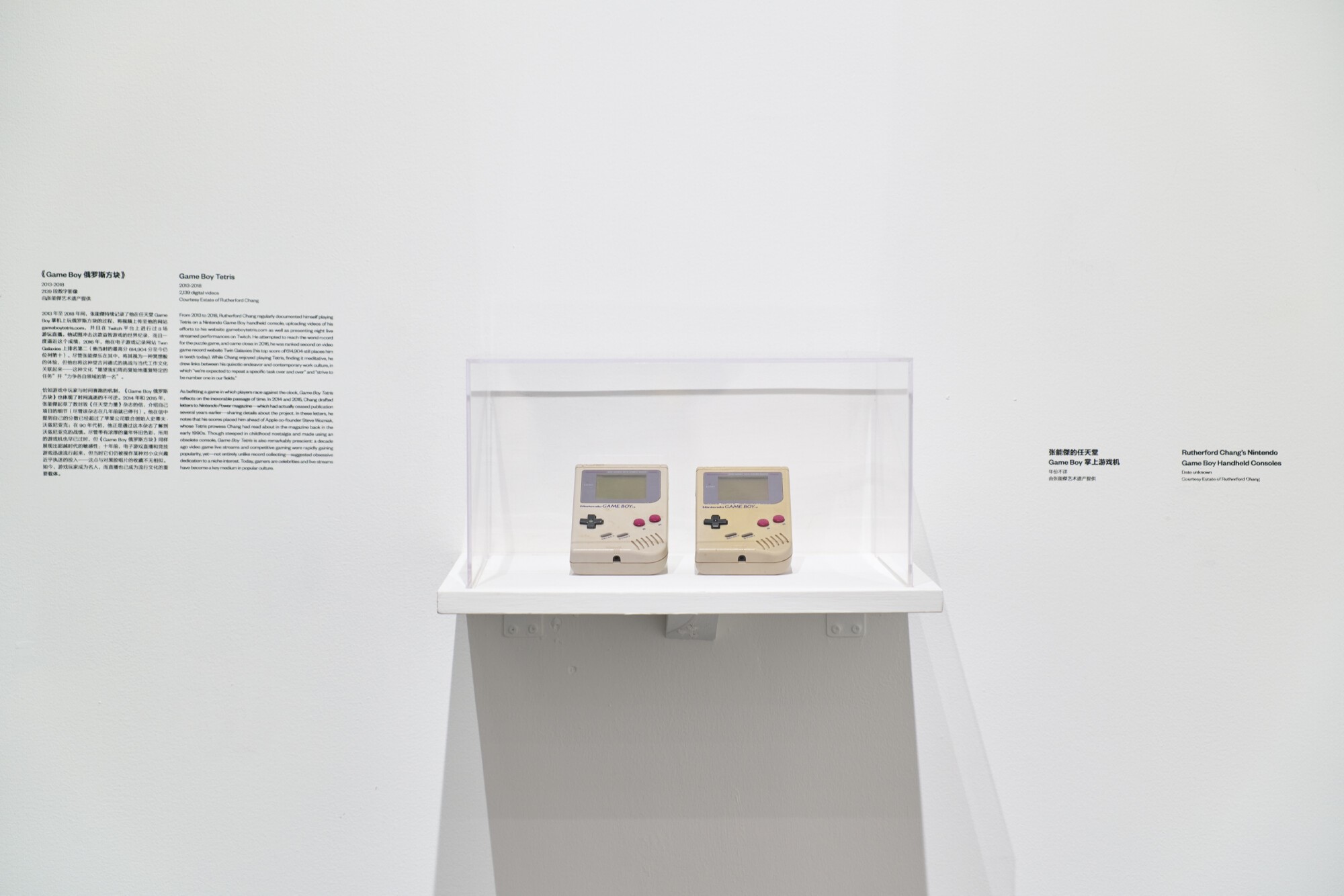 展览中的另一件重要作品《Game Boy俄罗斯方块》(2013-2018)为一个行为性项目,包含逾2000段《俄罗斯方块》录像、艺术家致《任天堂力量》杂志的信件,以及他所使用的掌上游戏机。作品创作于2013年至2018年间,记录了艺术家通过重复、耐力与自我设定的衡量体系,对“劳动”进行的持续性探索。张能傑记录了他在任天堂Game Boy掌上游戏机(此设备亦于展览中展出)上玩《俄罗斯方块》的过程,并将视频上传至自己的网站gameboytetris.com(以便观众可按分数搜索游戏记录),此外他还曾在Twitch平台进行过8场游戏直播。尽管艺术家将此视为一种冥想式的体验,但同时也对《俄罗斯方块》的世界纪录发起了堂吉诃德式的挑战。2016年,他曾在电子游戏记录网站Twin Galaxies上短暂排名第二,其最高分614,904分至今仍位列历史第十。