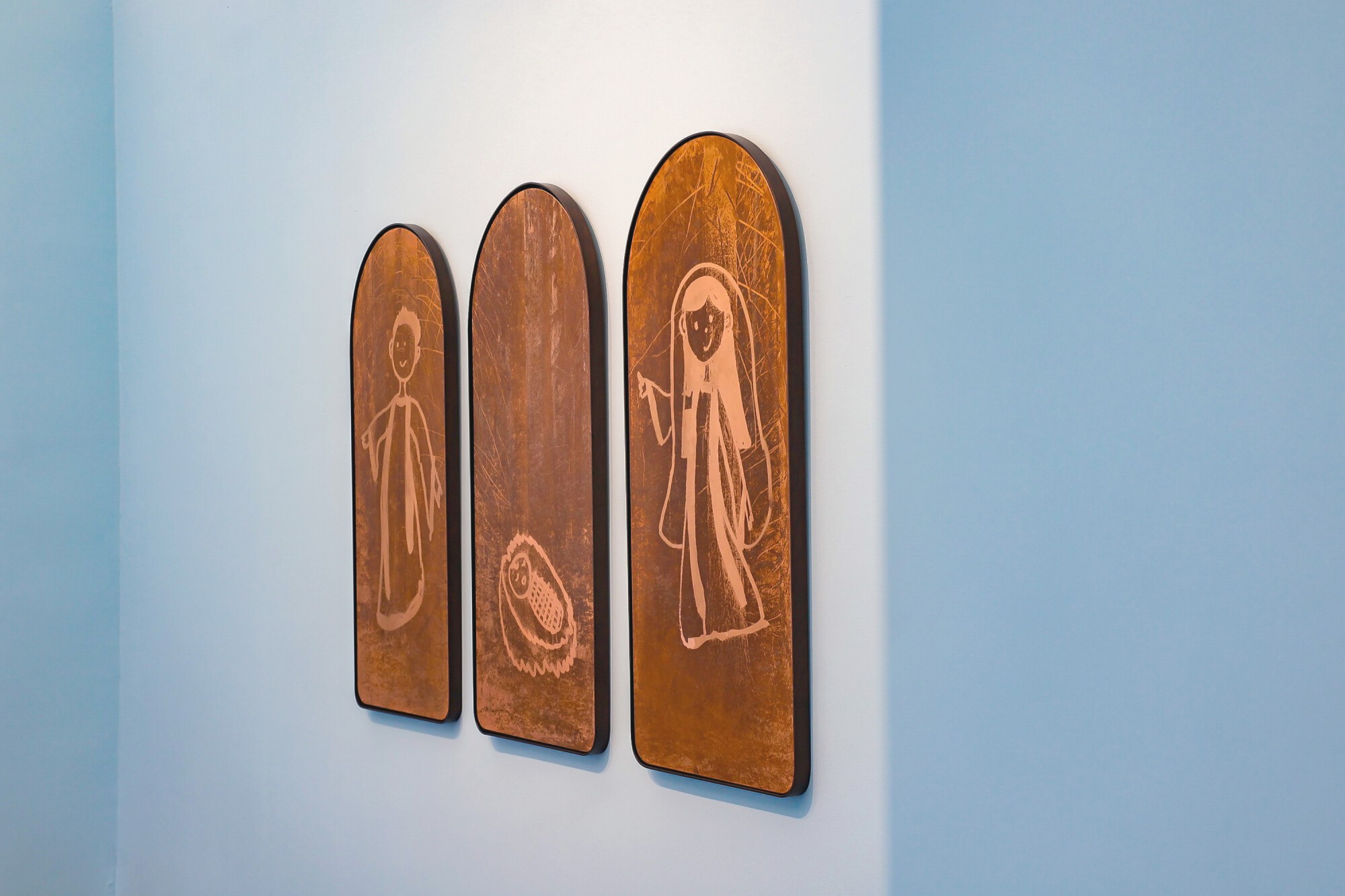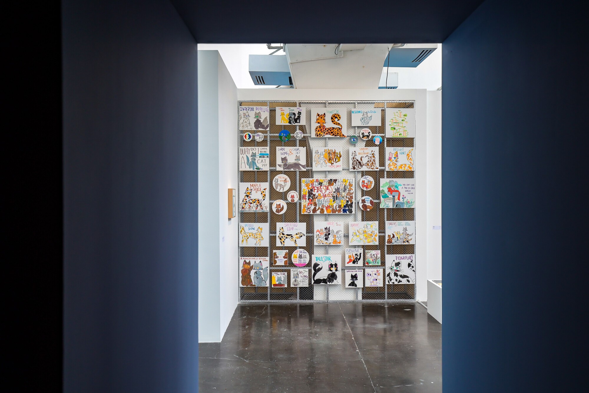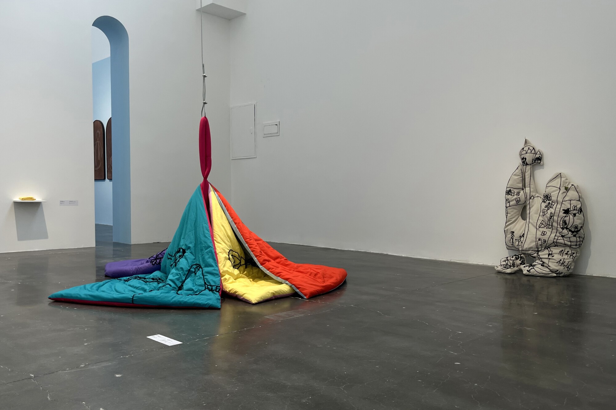 进入展厅,首先看到的是谭卓和儿子阳明使用陶瓷这一具有历史意义的材料合作的瓷板画,母子二人在作品充满偶然的创作过程中,体会互相影响、磨合、关照的必然。唐永祥与女儿唐郢泽画笔下的猫并置于相邻的两面墙上,父女俩的创作以真实的世界和虚构的世界作为不同的参照展开对话。徐渠用拼贴、刺绣的手法,将女儿徐拾的涂鸦再现于一大一小两本书中,大大的书像是一床安全的被子,包容着孩子的各种情绪和想象力,而小小的书犹如心中不易被察觉的小秘密,却是孩子的一种坚守,同时也在提醒着父亲需要回到无知无畏、对事物充满新鲜感的状态。