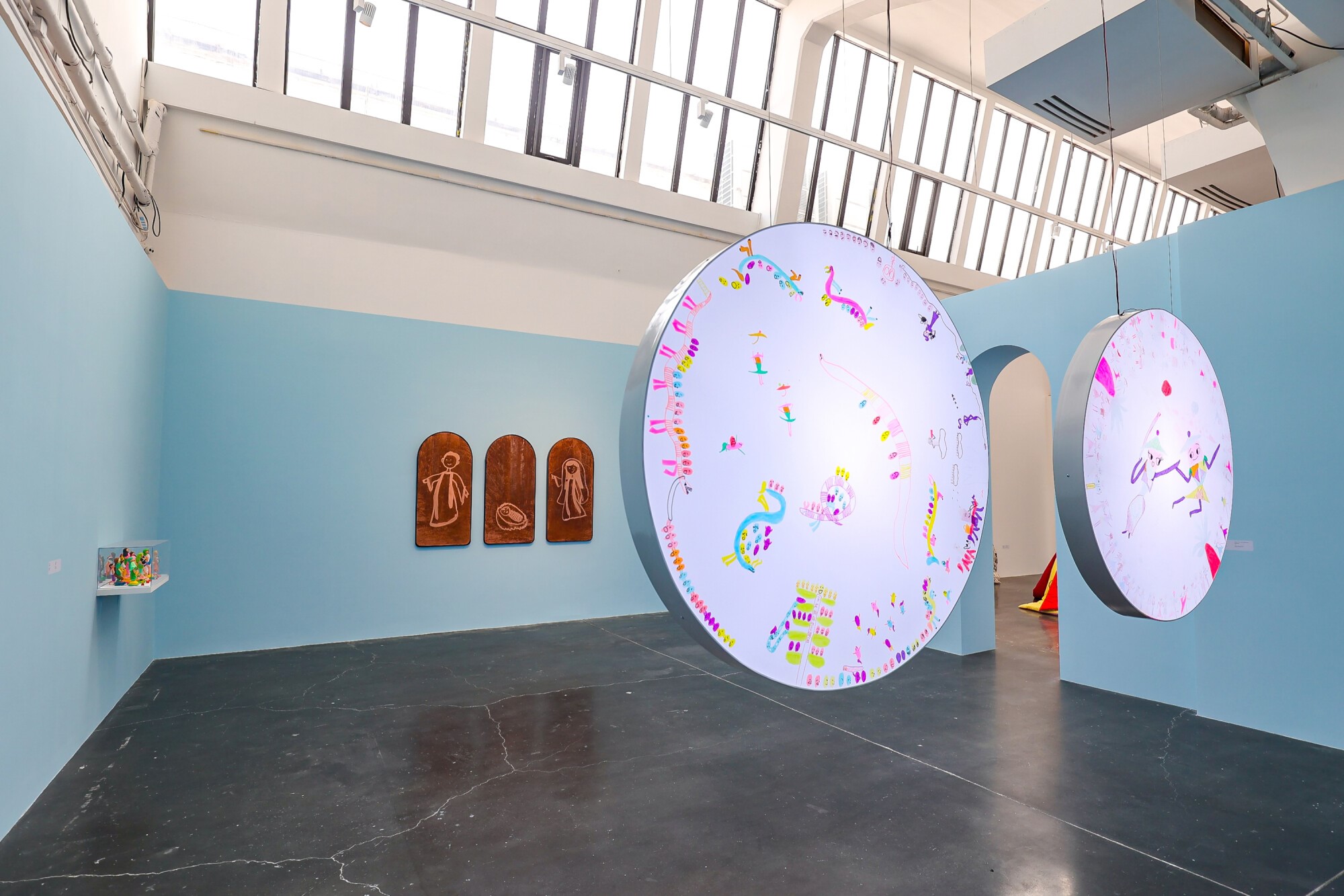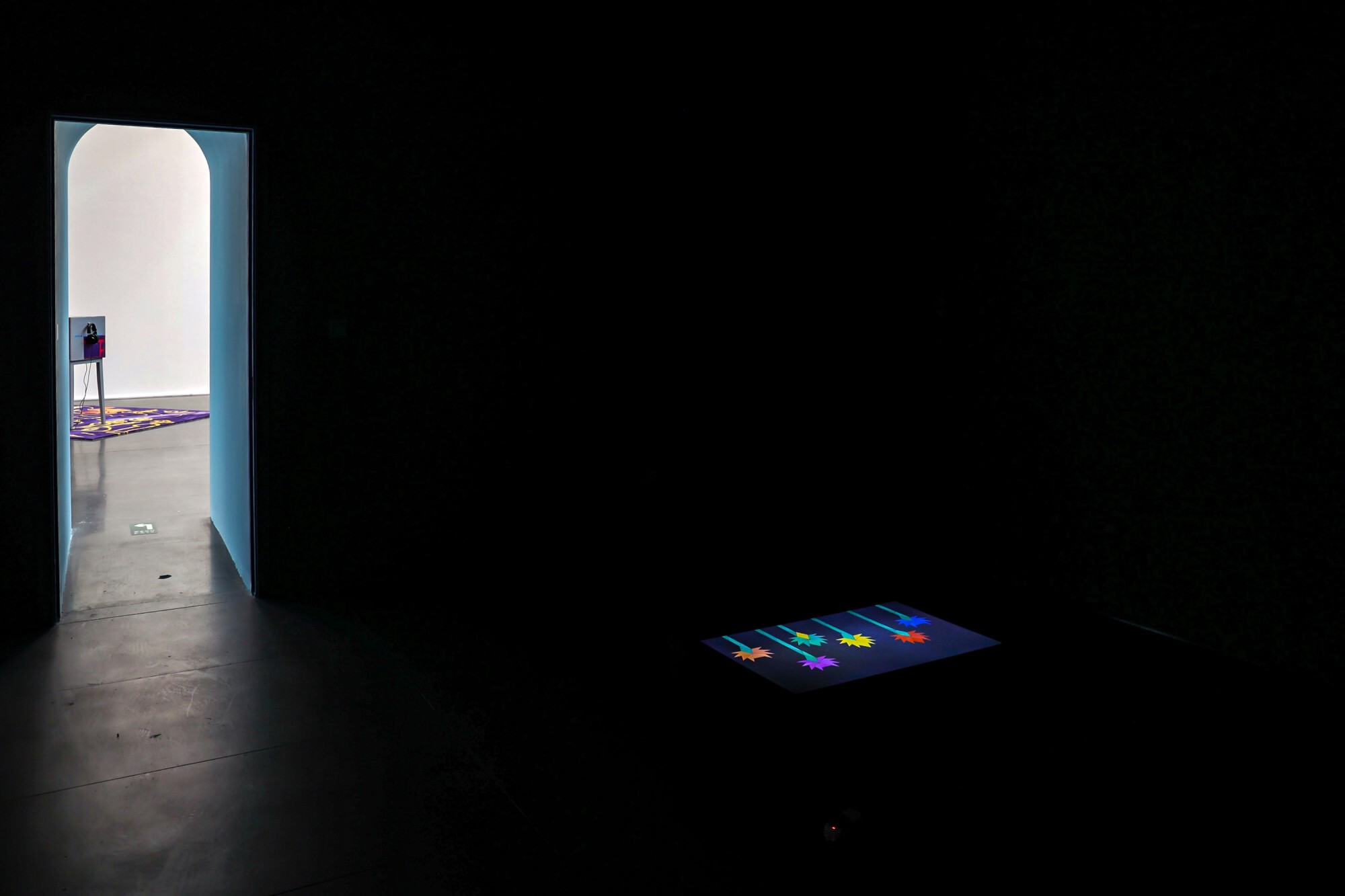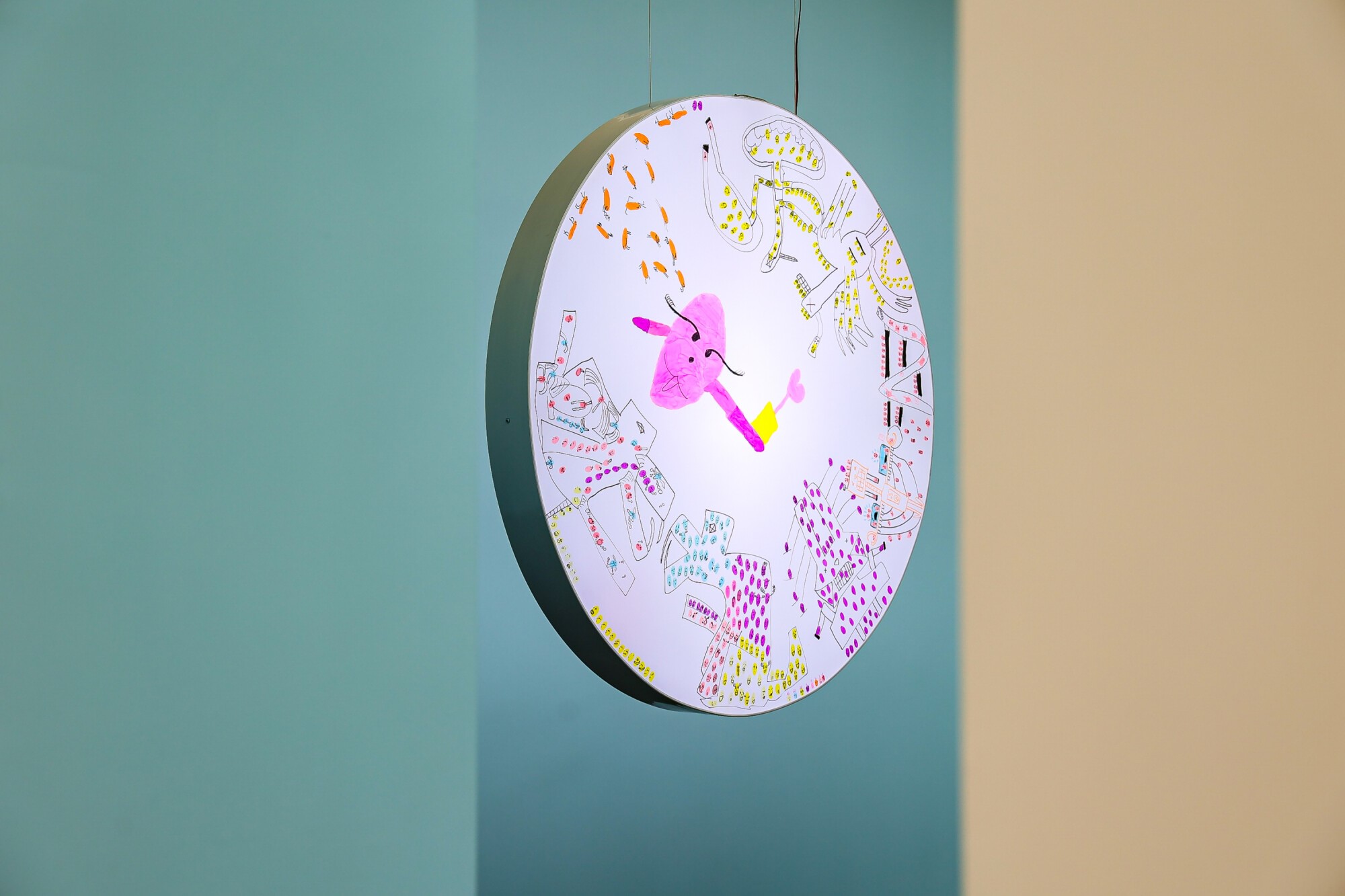 随后的几组作品使展览主题进一步延伸,陈文波在作品中用超写实的绘画手法模仿儿子陈俊博两岁时的涂鸦,对他来说,跟随孩子的笔迹是一种在绘画上重获自由的体验。而刚刚进入青春期的陈俊博则对世界的虚拟和真实提出了个人的反思。雷磊本次展出的彩色动画短片,延续他的个人项目《一个人的美术制片厂》,凭着记忆中的图像,用孩子的方式讲述人世间的故事,而铺陈于地面的地毯原型由他6岁的女儿想想绘制,这组作品共同构成了父女两人充满纯真想象力的世界,用儿童的方式模糊掉成人世界的尖锐。而母亲柴觅的作品——互动装置《集体游戏》在母女二人的日常游戏中产生,她将这场日常游戏延展到现场,邀请更多的大人和孩子一起参与其中,体会创造和图像的生成,并反思这一人类的基本欲望。