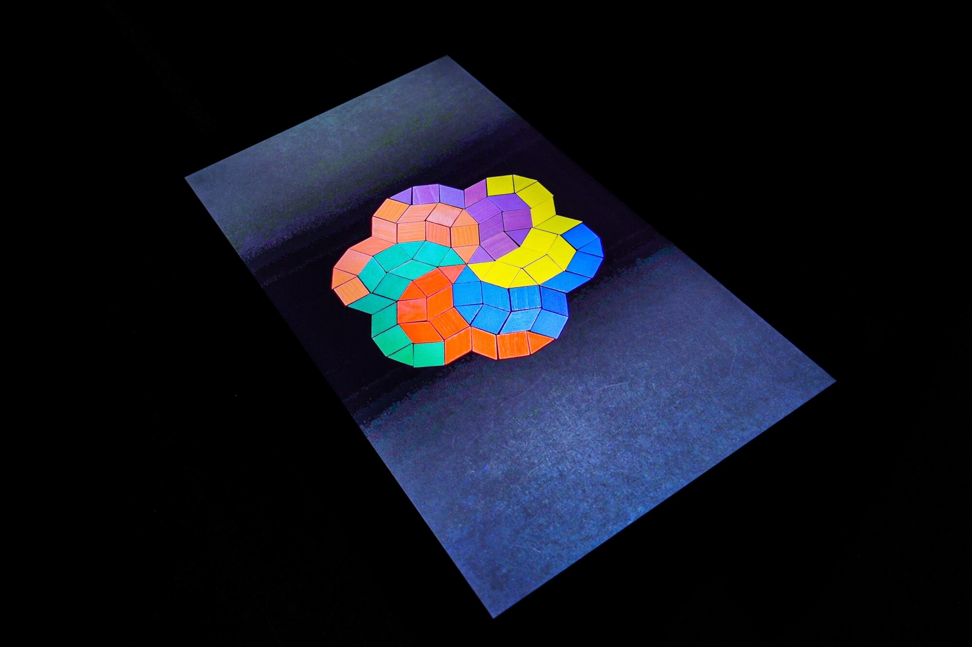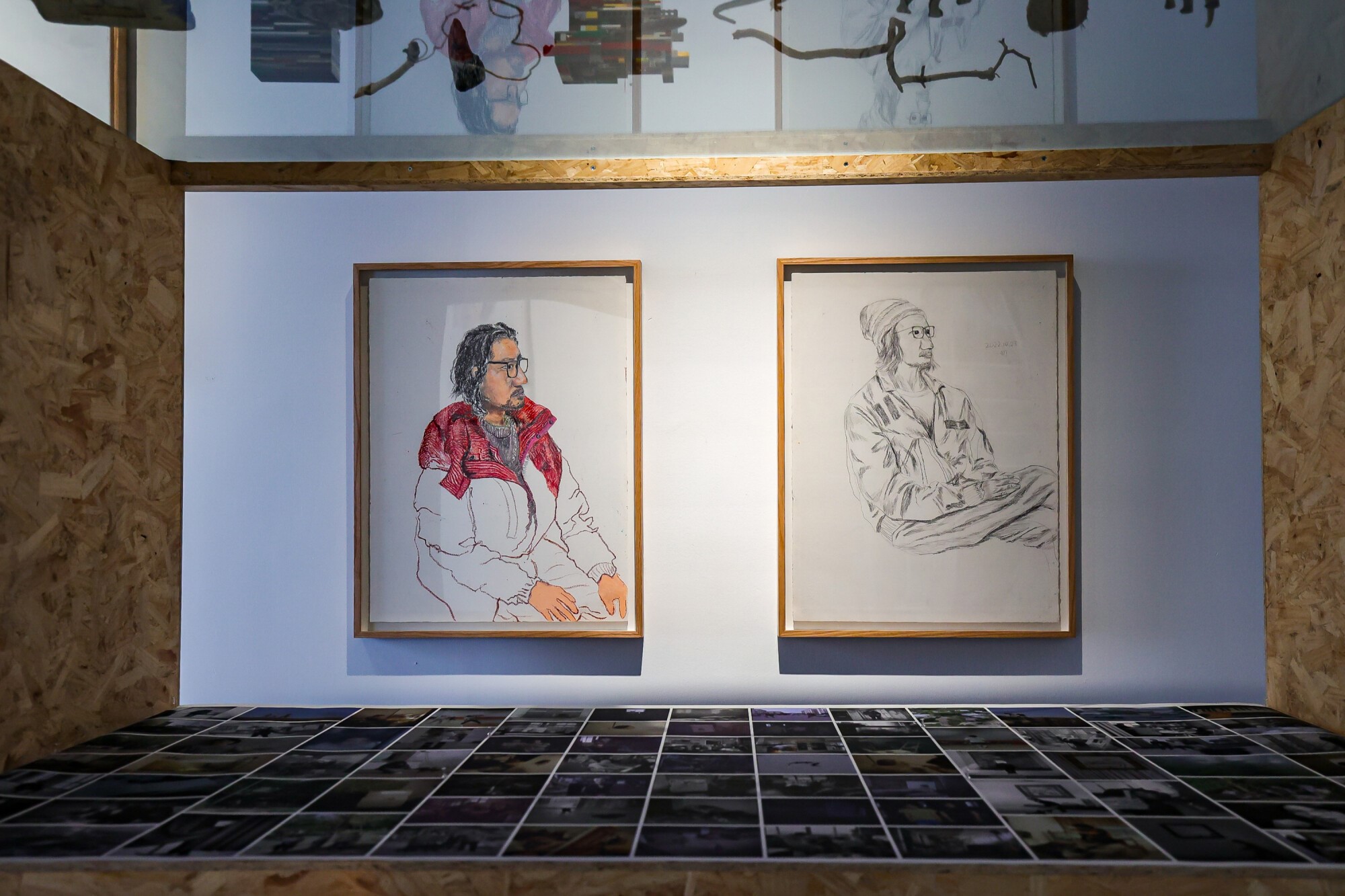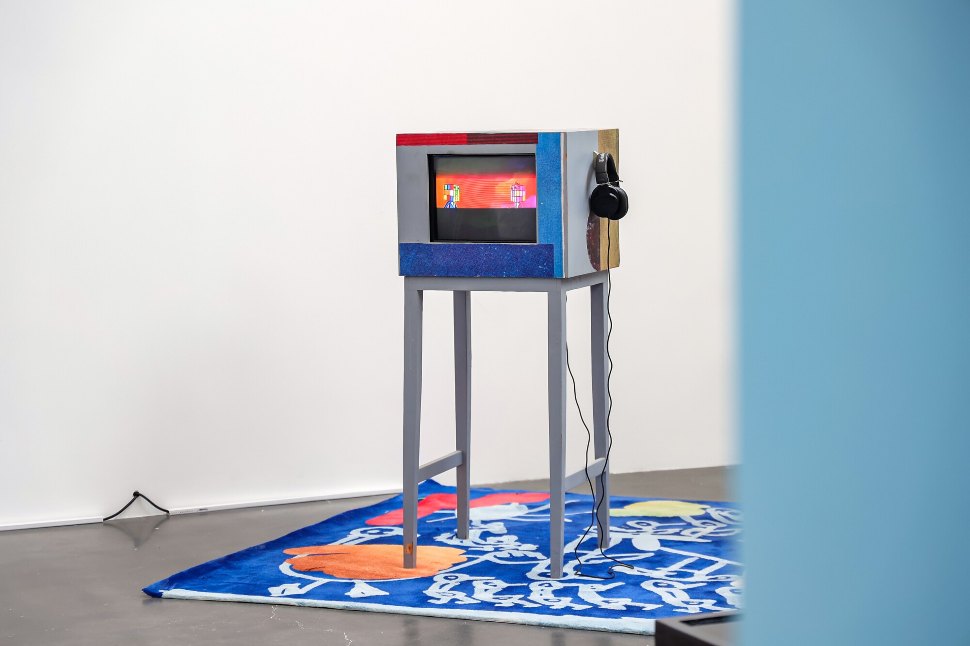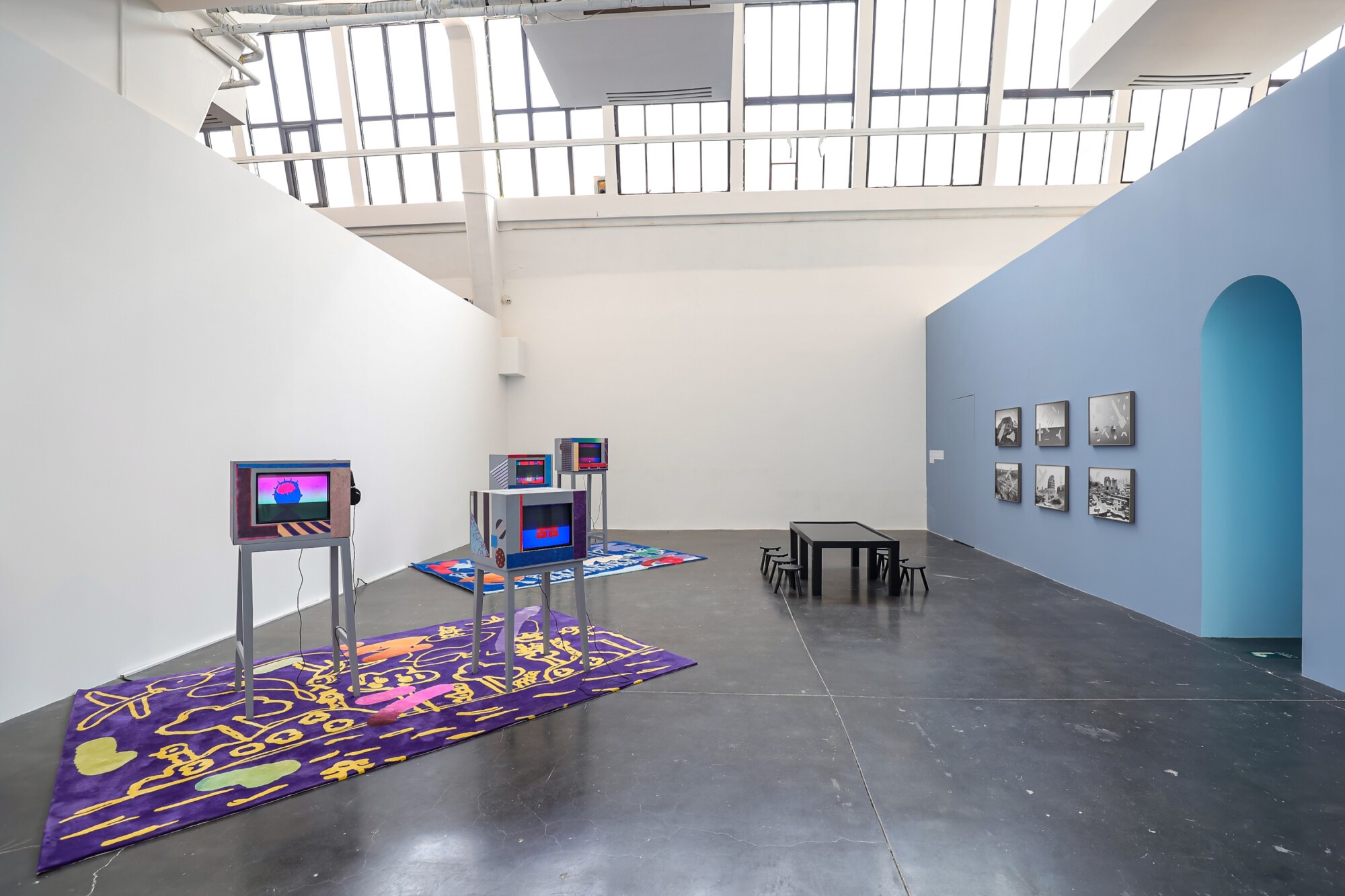 随后的几组作品使展览主题进一步延伸,陈文波在作品中用超写实的绘画手法模仿儿子陈俊博两岁时的涂鸦,对他来说,跟随孩子的笔迹是一种在绘画上重获自由的体验。而刚刚进入青春期的陈俊博则对世界的虚拟和真实提出了个人的反思。雷磊本次展出的彩色动画短片,延续他的个人项目《一个人的美术制片厂》,凭着记忆中的图像,用孩子的方式讲述人世间的故事,而铺陈于地面的地毯原型由他6岁的女儿想想绘制,这组作品共同构成了父女两人充满纯真想象力的世界,用儿童的方式模糊掉成人世界的尖锐。而母亲柴觅的作品——互动装置《集体游戏》在母女二人的日常游戏中产生,她将这场日常游戏延展到现场,邀请更多的大人和孩子一起参与其中,体会创造和图像的生成,并反思这一人类的基本欲望。