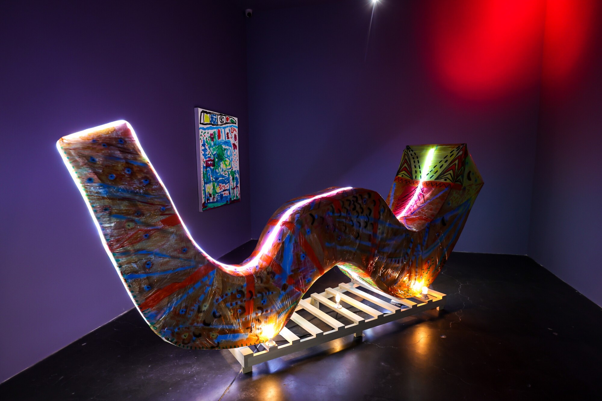 随展览动线通过拱门,马秋莎与女儿苏小鲜的作品《森林》呈现了各自童年时期的精神世界,前者贯穿着与父母之间既依恋又压抑的情感和成长记忆,后者则生长出强大的自我意识,自由且笃定。在杨光南与女儿杨闲闲合作的《风景》中,母女达成平等对话,母亲参照女儿的身高制作了悬挂于空中的圆形灯箱,意指包含热源的衬景、土壤,也似一束被施予爱意的目光,而杨闲闲则在空白的灯箱上肆意创造,使其焕发出多彩的光芒并照亮某个未知的方向。《日常关系》同时呈现父子的视角:孩子陈铠町用绘画的形式记录父亲和他周遭的环境,父亲陈彧君则用摄影的方式记录孩子的成长,这些亲密的瞬间循着时间的轨迹,形成家的记忆和对生命的感受。通过一条狭小的通道,一条三米多的金龙直逼眼前,麻剑锋在展厅里重现儿子王亮凯梦境中的场景,孩子偶然的讲述,连同他的记忆构成了本次作品里的形象与氛围。
