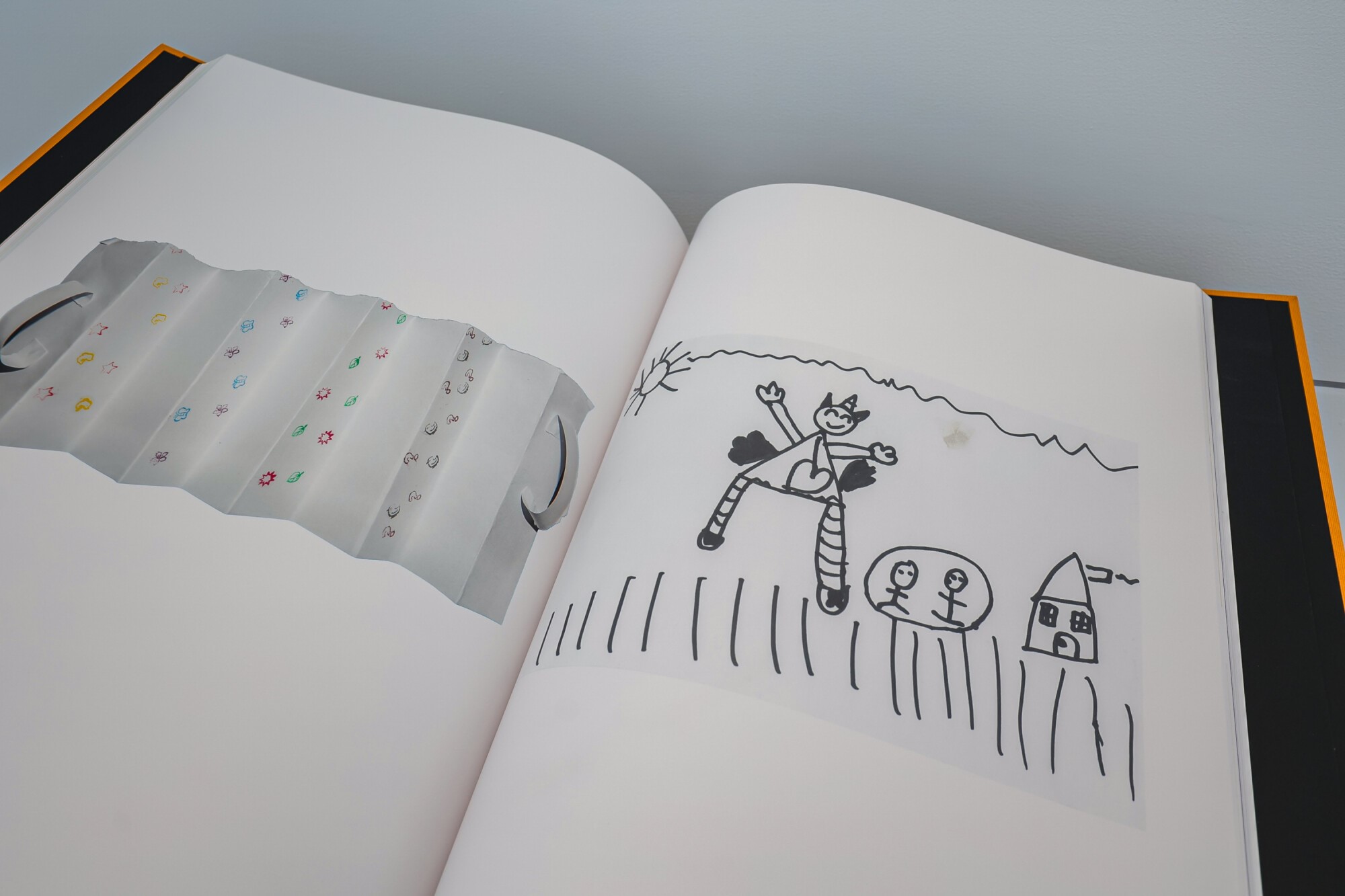 接下来,三个家庭的故事通过影像和手工书铺陈开来。李带菓、李姝睿与儿子陈我我在《七天家庭教育》中展示了封闭期间贯穿于日常生活中的家庭教育,漫长的例外状况之中如何为孩子创造安心的生活,又应该教给他什么?或许答案就散落在朴实温馨的生活瞬间。设计师朱砂为很多作家和艺术家做书,此次他为女儿朱看看做了一本同名大画册,收录了她从2岁到7岁创作的146件作品,这些作品被精心编排、设计、印刷,最后恭恭敬敬地摆在实木支撑架上,艺术家似乎也在用这种方式向观众发问:你是否愿意花时间细细品读孩子的艺术,关注孩子的情绪和想法,理解他们内心的愿望和期待?《会说不会写》和《会写不会说》由鞠婷和两个女儿秦澈、秦澄共同创作,源自女儿们两段语言学习的经历。语言是自我和世界连接的工具,作品通过孩童学习语言的片段来讲述文化差异性的衰落和面对陌生文化的新鲜和迷失。