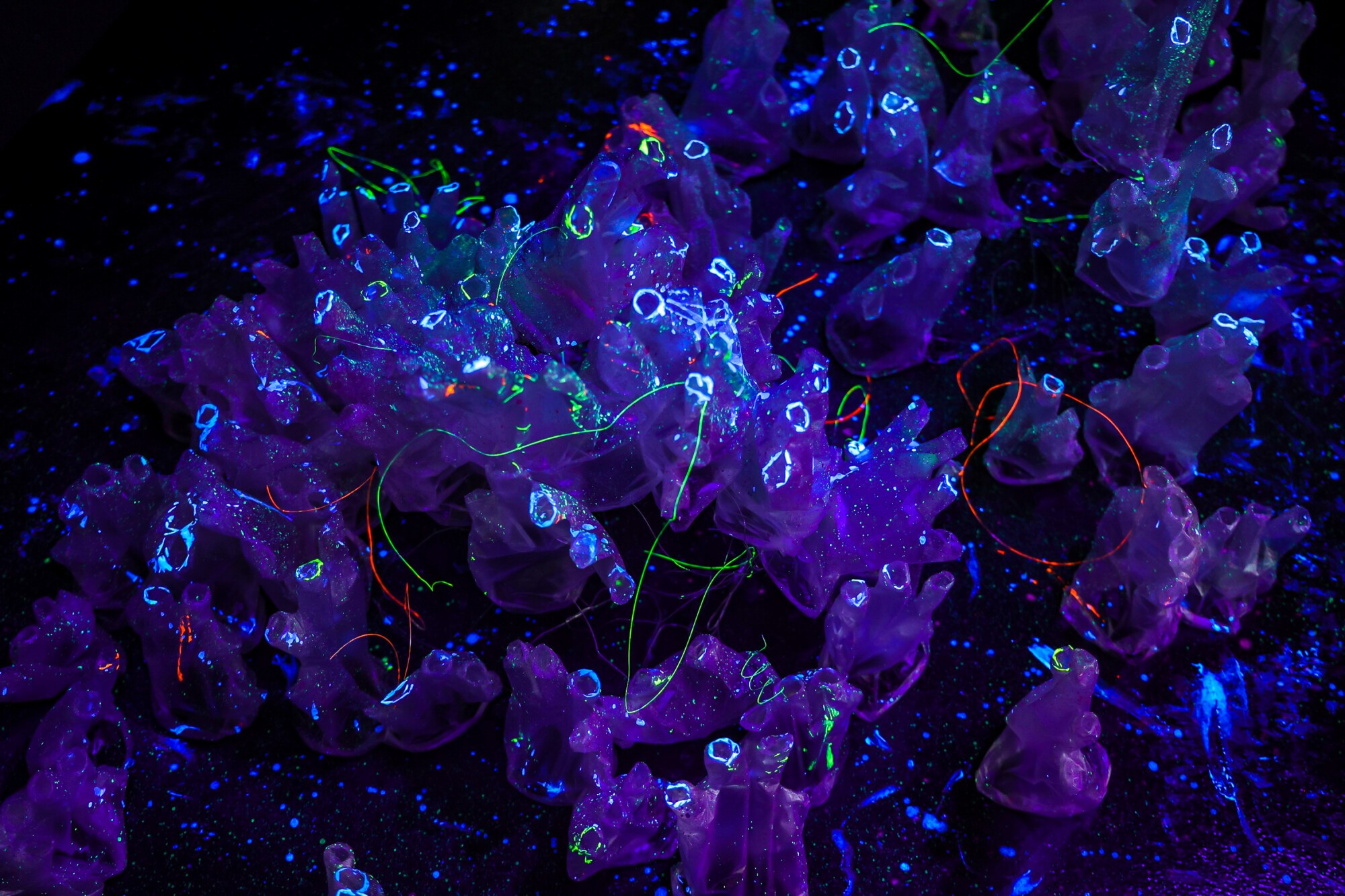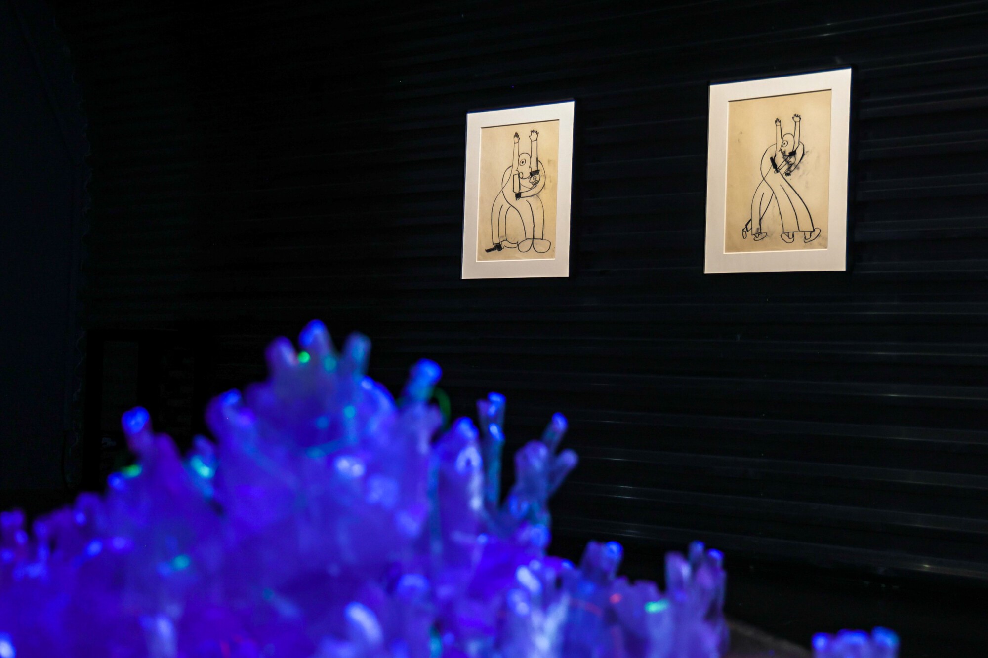 在最后一个展厅,蒋志展出《看与知,或命运之爱》特别版本,单屏呈现营造的自然景观与节奏缓慢的背景音乐,似乎在诉说错综复杂的感情世界表象之下,是微小的物质性结构在运作,那些被视为难以捉摸的悲喜和因此引发的交流和互动。另外两件纸本作品分别是儿子蒋传铭的作品《检查游戏》和《接触》,用漫画的形式指向对人的身体和思想的获取中对于权利的反思。另一侧,一米见方的展台上,一簇簇散发着幽暗之光的物体是女儿蒋芸柯的作品,物体似海底的发光生物,隐喻照亮、吸引、伪装、迷惑、警戒——这些人与人接触中所触发的情感动机。三人的作品呈现于银色镜面空间中,当观众步入这个空间,作品营造的氛围与镜中的“自我”一同乱入心绪,将本次展览所探讨的问题从父母和孩子之间实践的亲密关系指向更广泛的人与人之间的关系。