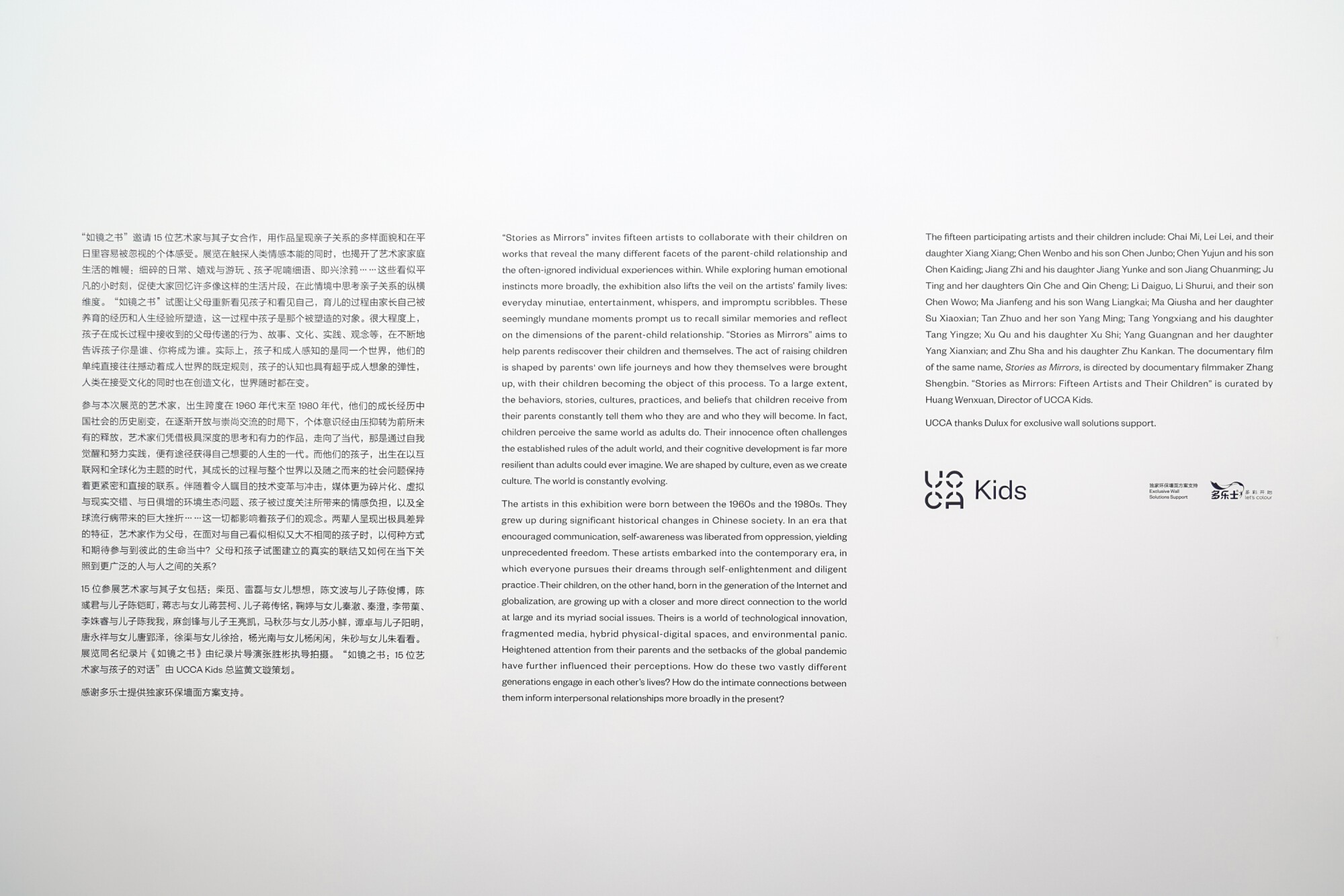 展览在触探人类情感本能的同时,也揭开了艺术家家庭生活的帷幔:细碎的日常、嬉戏与游玩、孩子呢喃细语、即兴涂鸦……这些看似平凡的小时刻,促使大家回忆许多像这样的生活片段,在此情境中思考亲子关系的纵横维度。参展艺术家及子女包括:柴觅、雷磊与女儿想想,陈文波与儿子陈俊博,陈彧君与儿子陈铠町,蒋志与女儿蒋芸柯、儿子蒋传铭,鞠婷与女儿秦澈、秦澄,李带菓、李姝睿与儿子陈我我,麻剑锋与儿子王亮凯,马秋莎与女儿苏小鲜,谭卓与儿子阳明,唐永祥与女儿唐郢泽,徐渠与女儿徐拾,杨光南与女儿杨闲闲,朱砂与女儿朱看看。“如镜之书:15位艺术家与孩子的对话”由UCCA Kids总监黄文璇策划。