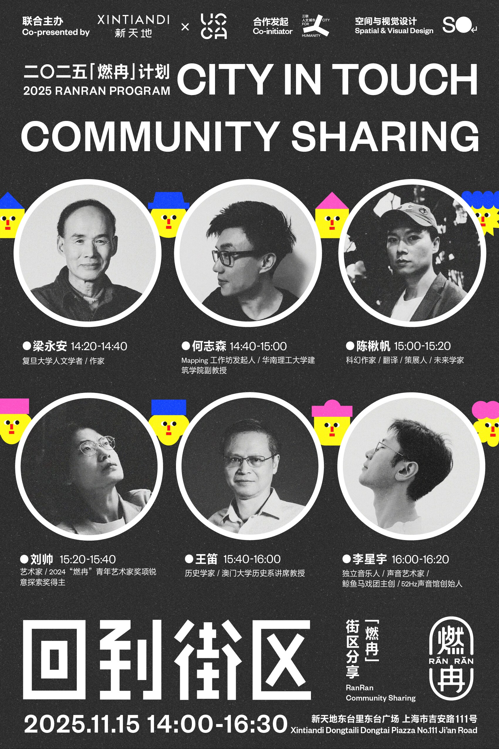 2025年11月15日,“燃冉”计划与三联人文城市首度携手,于新天地东台里特别营造的“城市剧场”之内,呈现一场马拉松式的街区分享。此举不仅是内容的跨界融合,其向公众免费开放、于街区分享的形式本身,即是“回到街区”这一理念最有力的实践——让严肃的学术与先锋的思考走出象牙塔,回归城市公共空间,与每一位市民的日常生活产生共振。本次活动汇聚了来自历史学、建筑学、科幻写作、艺术创作等不同领域的六位杰出讲者:深耕比较文学与青年文化研究的学者梁永安;以微观史视角洞见城市公共生活的历史学家王笛;以独特“Mapping”方式探索空间与权力关系的建筑师与艺术家何志森;以文学笔触勾勒未来图景的科幻作家与未来学家陈楸帆;以及通过声音采集探索听觉艺术边界的声音艺术家李星宇;以迁徙生物视角凝视城市与生态共生的艺术家刘帅。他们以各自独特的学科背景与生命经验为基底,共同回应“回到街区”的时代呼唤。探讨在当下如何重新审视并激活街区这一最古老、最富生命力的公共场域,并找回失落的人际联结与城市温度。这不仅是一场智识的盛宴,更是一次旨在激发公众参与、重塑城市人文精神的社会实践。