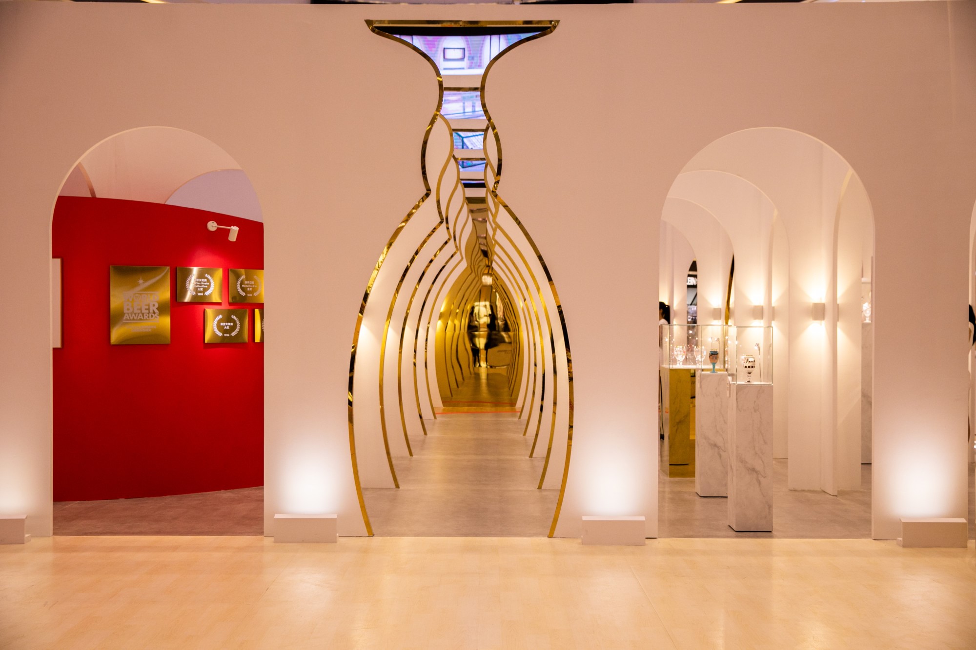 作为比利时知名的窖藏啤酒,时代啤酒一直以其注重内在品质的酿造,追求优质生活的品牌态度为人所熟知。它起初作为一款圣诞节啤酒在鲁汶酿造,并被命名为“Stella”,拉丁语意为“星星”。经历了近600多年的历史沉淀,时代啤酒始终坚持精选优质大麦和欧洲贵族啤酒花,严格传承了1366年延续至今的高品质。此次展览设计概念的缘起,由时代啤酒这段600余年的欧洲历史而来,设计师选取了“拱廊”为主要空间构成元素,空间上由数十个拱形墙共同组成了一个兼具通透性与围合性的空间,令参观者在穿行过程中联想到欧洲历史建筑,感受品牌优雅与精致的文化特性。